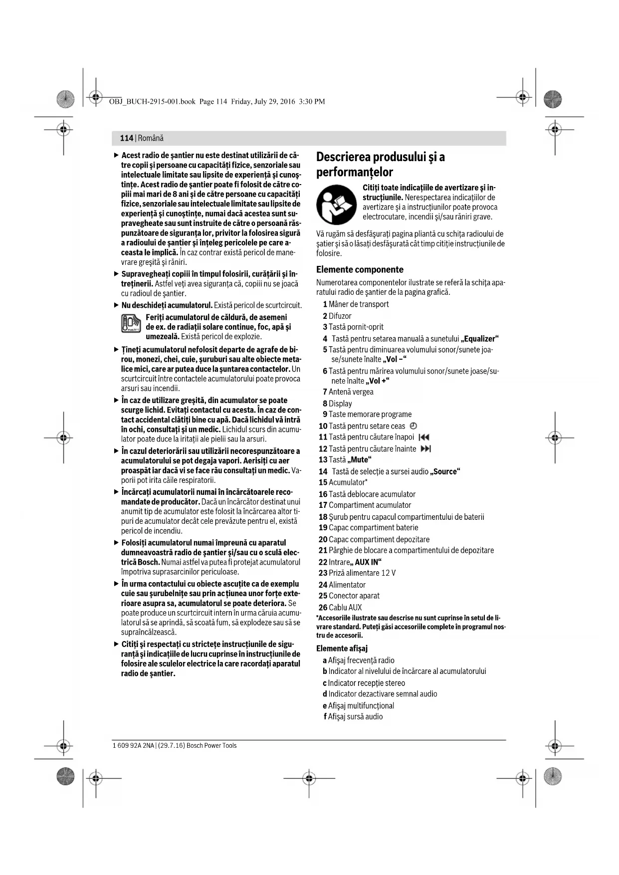 Бұл литий-иондық аккумуляторлар қауіпті тауарларға қойылатын талаптарға сай болуы керек. Пайдаланушы аккумуляторларды көшеде қосымша құжаттарсыз тасымалдай алады. Үшінші тұлғалар (мысалы, әуе көлігі немесе жіберу) орамаға және маркаларға қойылатын арнайы талаптарды сақтау керек. Жіберуге дайындау кезінде қауіпті жүктер маманына хабарласу керек. Аккумуляторды корпусы зақымдалған болса ғана жіберіңіз. Ашық түйіспелерді желімдеңіз және аккумуляторды орамада қозғалмайтындай ораңыз. Қажет болса, қосымша ұлттық ережелерді сақтаңыз. Кәдеге жарату Құрылыс алаңы радиоқабылдағыштарын, штекерлік қуат блоктарын, аккумуляторларды, керек-жарақтар мен орамдарын қоршаған ортаны қорғаған ретте кәдеге жарату керек. Құрылыс алаңы радиоқабылдағыштары, штекерлік қуат блоктары мен аккумулятор/батареяларды үй қоқысына тастамаңыз! Тек қана ЕО елдері үшін: Еуропа 2012/19/EU ережесі бойынша жарамсыз электр құралдары және Еуропа 2006/66/EC ережесі бойынша зақымдалған немесе ескі аккумулятор/батареялар бөлек жиналып, кәдеге жаратылуы қажет. Аккумуляторлар/батареялар: Литий-иондық: “Тасымалдау” тарауындағы, 113 бетіндегі нұсқауларды орындаңыз. Техникалық өзгерістер енгізу құқығы сақталады. Română Instrucţiuni privind siguranţa şi pro- tecţia muncii Citiţi toate instrucţiunile şi indica- ţiile privind siguranţa, de asemeni şi informaţiile inscripţionate pe partea posterioară a radi- oului de şantier. Nerespectarea instrucţiunilor şi indicaţiilor privind siguranţa poate cauza electrocutare, incendiu şi/sau răniri grave. Păstraţi toate instrucţiunile şi indicaţiile privid siguranţa în vederea unei utilizări ulterioare. Termenul radio de şantier folosit în instrucţiunile de siguranţă se referă la aparate radio de şantier alimentate de la reţea (cu alimentator) şi aparate radio de şantier cu acumulator (fără alimentator). Menţineţi-vă sectorul de lucru curat şi bine iluminat. Dezordinea sau sectoarele de lucru neluminate pot duce la accidente. Ştecherul de la reţea al alimentatorului trebuie să se potrivească la priza de curent. Nu este permisă nicio modificare a ştecherului. Nu folosiţi adaptoare de şte- chere împreună cu aparate radio de şantier. Ştecherele nemodificte şi prizele de curent potrivite reduc riscul de elecrocutare. Nu folosiţi cablul alimentatorului în alte scopuri decât acela căruia îi este destinat, pentru a transporta, sus- penda radioul de şantier sau pentru a trage ştecherul a- fară din priza de curent. Feriţi cablul de căldură, ulei, muchii ascuţite sau componente de scule electrice afla- te în mişcare. Cablurile deteriorate sau încâlcite măresc riscul de electrocutare. Derulaţi complet cablul de alimentare al alimentatoru- lui înainte de a folosi radioul de şantier cu alimentare de la reţea. În caz contrar cablul de alimentare se poate în- călzi. Aveţi grijă ca ştecherul de la reţea să poată fi extras din priză în orice moment. Scoaterea ştecherului din priza de curent este singura posibilitate de a debranşa radioul de şantier de la reţeaua electrică. Feriţi radioul de şantier şi alimentatorul de ploaie şi umezeală. Pătrunderea apei în radioul de şantier sau în alimentator creşte riscul de electro- cutare. Meţineţi curate radioul şi alimentatorul. Eventualele murdării pot duce la electrocutare. Înainte de fiecare utilizare verificaţi radioul de şantier, alimentatorul, cablul şi ştecherul. Nu folosiţi radioul de şantier în cazul în care constataţi defecţiuni la acesta. nu deschdeţi singuri radioul de şantier şi alimentatorul şi nu permiteţi repararea acestora decât de către per- sonal de specialitate corespunzător calificat şi numai cu piese de schimb originale. Radiourile de şantier, ali- mentatoarele, cablurile şi ştecherele defecte măresc riscul de electrocutare. AVERTISMENT OBJ_BUCH-2915-001.book Page 113 Friday, July 29, 2016 3:30 PM114 | Română 1 609 92A 2NA | (29.7.16) Bosch Power Tools Acest radio de şantier nu este destinat utilizării de că- tre copii şi persoane cu capacităţi fizice, senzoriale sau intelectuale limitate sau lipsite de experienţă şi cunoş- tinţe. Acest radio de şantier poate fi folosit de către co- piii mai mari de 8 ani şi de către persoane cu capacităţi fizice, senzoriale sau intelectuale limitate sau lipsite de experienţă şi cunoştinţe, numai dacă acestea sunt su- pravegheate sau sunt instruite de către o persoană răs- punzătoare de siguranţa lor, privitor la folosirea sigură a radioului de şantier şi înţeleg pericolele pe care a- ceasta le implică. În caz contrar există pericol de mane- vrare greşită şi răniri. Supravegheaţi copiii în timpul folosirii, curăţării şi în- treţinerii. Astfel veţi avea siguranţa că, copiii nu se joacă cu radioul de şantier. Nu deschideţi acumulatorul. Există pericol de scurtcircuit. Feriţi acumulatorul de căldură, de asemeni de ex. de radiaţii solare continue, foc, apă 