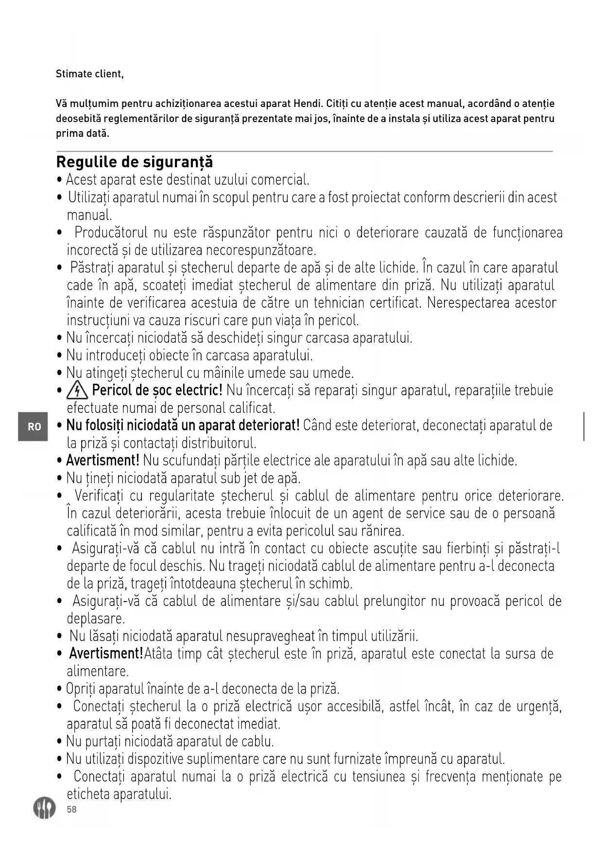 Stimate client, Vă mulțumim pentru achiziționarea acestui aparat Hendi. Citiți cu atenție acest manual, acordând o atenție deosebită reglementărilor de siguranță prezentate mai jos, înainte de a instala și utiliza acest aparat pentru prima dată. Regulile de siguranță