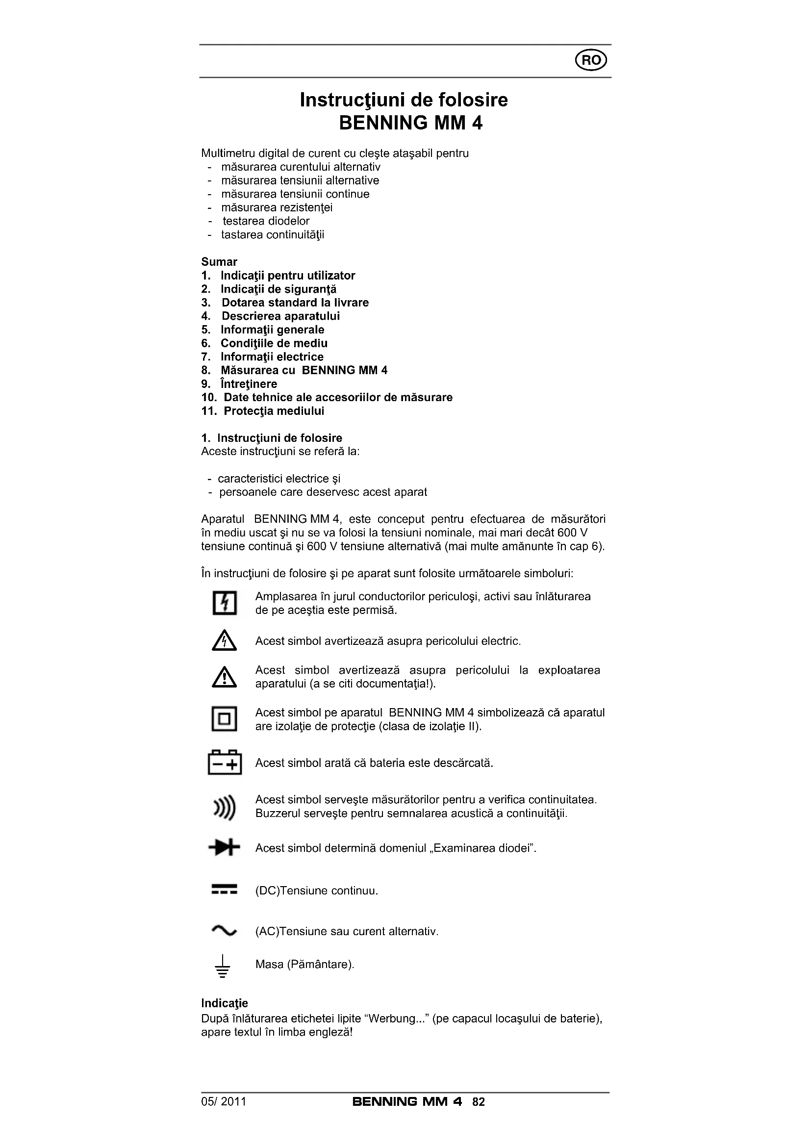 Aceste instrucţiuni se referă la: - caracteristici electrice şi - persoanele care deservesc acest aparat Aparatul BENNING MM 4, este conceput pentru efectuarea de măsurători în mediu uscat şi nu se va folosi la tensiuni nominale, mai mari decât 600 V tensiune continuă şi 600 V tensiune alternativă (mai multe amănunte în cap 6). În instrucţiuni de folosire şi pe aparat sunt folosite următoarele simboluri: Amplasarea în jurul conductorilor periculoşi, activi sau înlăturarea de pe aceştia este permisă.