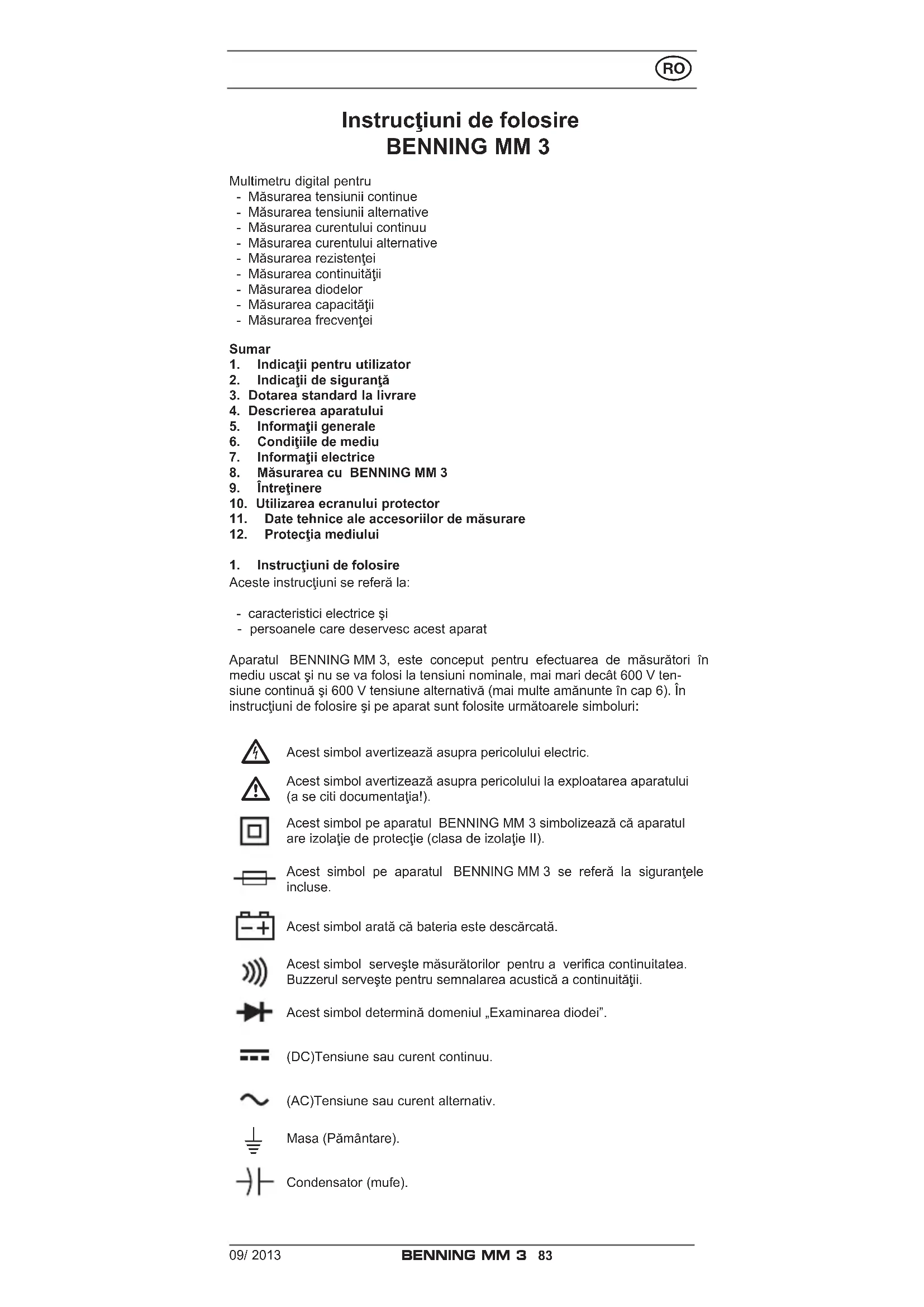 Aceste instrucţiuni se referă la: - caracteristici electrice şi - persoanele care deservesc acest aparat Aparatul BENNING MM 3, este conceput pentru efectuarea de măsurători în mediu uscat şi nu se va folosi la tensiuni nominale, mai mari decât 600 V ten- siune continuă şi 600 V tensiune alternativă (mai multe amănunte în cap 6). În instrucţiuni de folosire şi pe aparat sunt folosite următoarele simboluri: