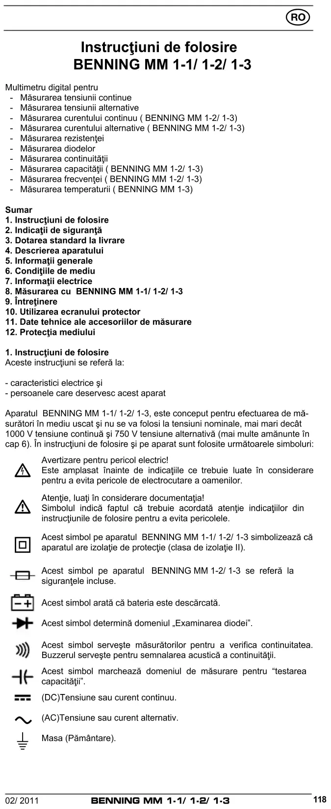 Instrucţiunidefolosire BENNING MM 1‑1/ 1‑2/ 1‑3 Multimetru digital pentru - Măsurarea tensiunii continue - Măsurarea tensiunii alternative - Măsurarea curentului continuu ( BENNING MM 1-2/ 1-3) - Măsurarea curentului alternative ( BENNING MM 1-2/ 1-3) - Măsurarea rezistenţei - Măsurarea diodelor - Măsurarea continuităţii - Măsurarea capacităţii ( BENNING MM 1-2/ 1-3) - Măsurarea frecvenţei ( BENNING MM 1-2/ 1-3) - Măsurarea temperaturii ( BENNING MM 1-3) Sumar 1.Instrucţiunidefolosire 2.Indicaţiidesiguranţă