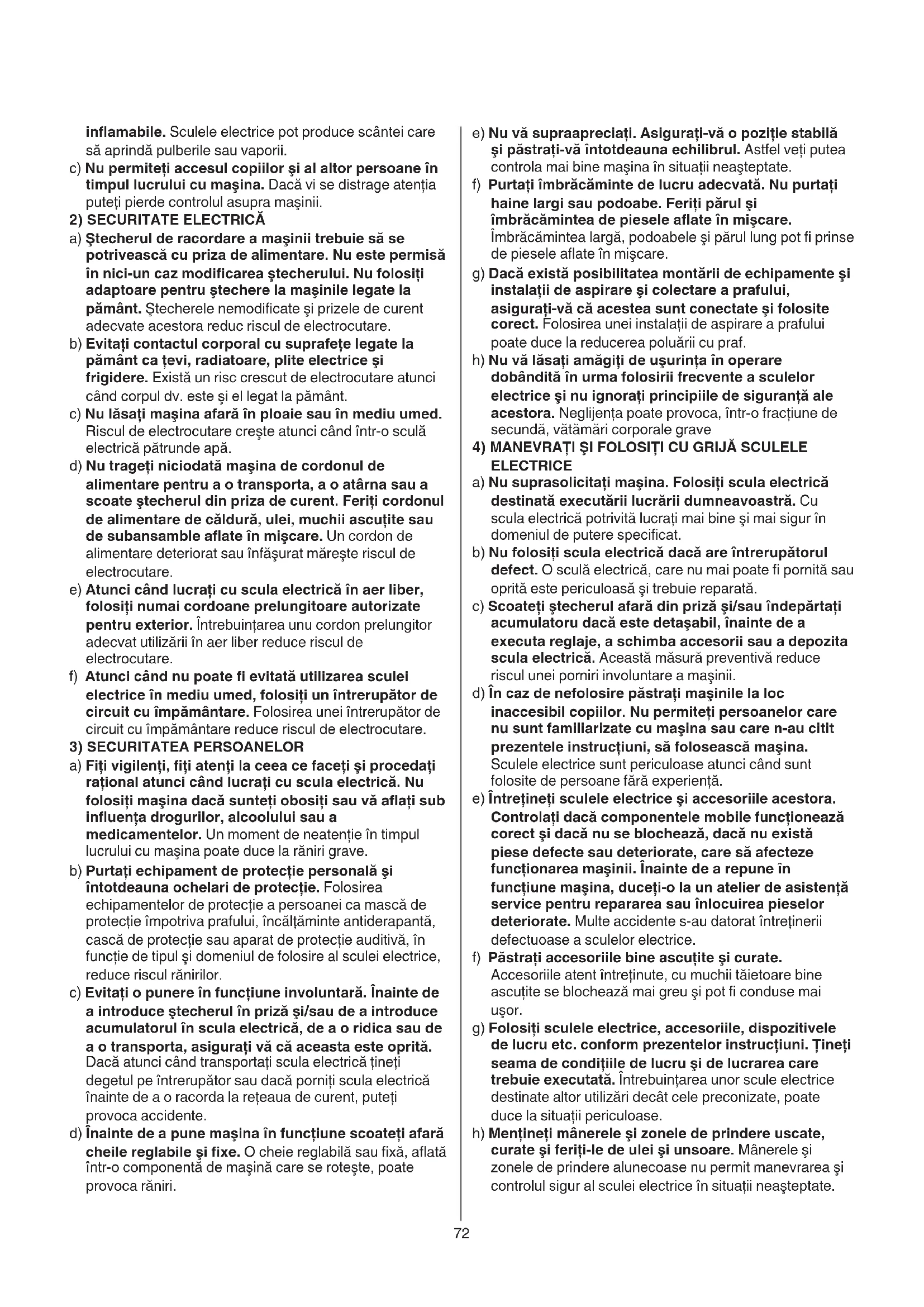 a) Păstraţi-vă locul de muncă curat şi bine iluminat. Dezordinea la locul de muncă sau existenţa unor sectoare de lucru neiluminate poate duce la accidente. b) Nu folosiţi maşina în medii cu pericol de explozie, acolo unde există lichide, gaze sau pulberi72 inflamabile. Sculele electrice pot produce scântei care să aprindă pulberile sau vaporii. c) Nu permiteţi accesul copiilor şi al altor persoane în timpul lucrului cu maşina. Dacă vi se distrage atenţia puteţi pierde controlul asupra maşinii.