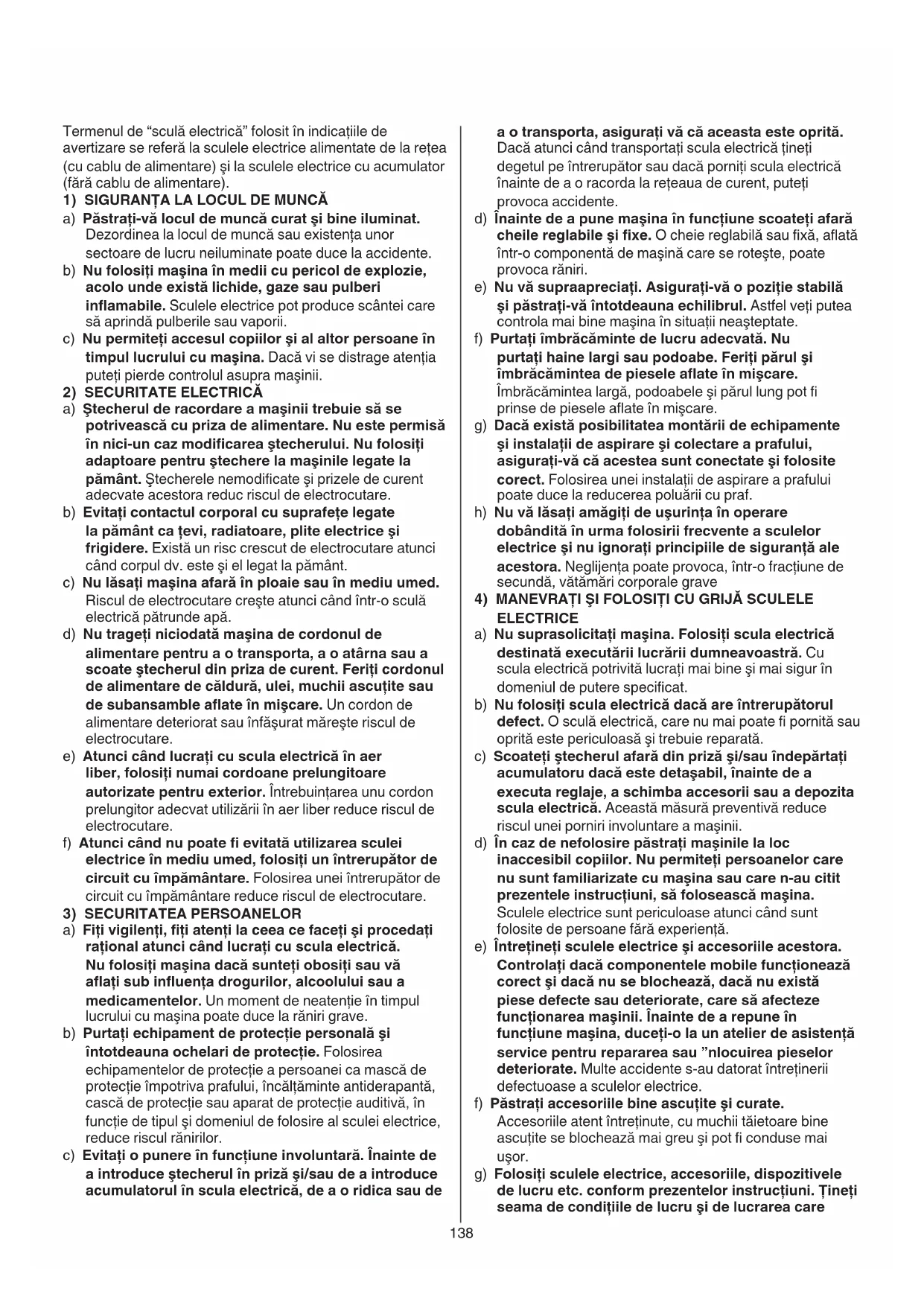 ELECTRICE a) Nu suprasolicitaţi maşina. Folosiţi scula electrică destinată executării lucrării dumneavoastră. Cu scula electrică potrivită lucraţi mai bine şi mai sigur în domeniul de putere specicat. b) Nu folosiţi scula electrică dacă are întrerupătorul defect. O sculă electrică, care nu mai poate pornită sau oprită este periculoasă şi trebuie reparată. c) Scoateţi ştecherul afară din priză şi/sau îndepărtaţi acumulatoru dacă este detaşabil, înainte de a executa reglaje, a schimba accesorii sau a depozita scula electrică. Această măsură preventivă reduce riscul unei porniri involuntare a maşinii. d) În caz de nefolosire păstraţi maşinile la loc inaccesibil copiilor. Nu permiteţi persoanelor care nu sunt familiarizate cu maşina sau care n-au citit prezentele instrucţiuni, să folosească maşina. Sculele electrice sunt periculoase atunci când sunt folosite de persoane fără experienţă. e) Întreţineţi sculele electrice şi accesoriile acestora. Controlaţi dacă componentele mobile funcţionează corect şi dacă nu se blochează, dacă nu există piese defecte sau deteriorate, care să afecteze funcţionarea maşinii. Înainte de a repune în funcţiune maşina, duceţi-o la un atelier de asistenţă service pentru repararea sau înlocuirea pieselor deteriorate. Multe accidente s-au datorat întreţinerii defectuoase a sculelor electrice. f) Păstraţi accesoriile bine ascuţite şi curate. Accesoriile atent întreţinute, cu muchii tăietoare bine ascuţite se blochează mai greu şi pot conduse mai uşor. g) Folosiţi sculele electrice, accesoriile, dispozitivele de lucru etc. conform prezentelor instrucţiuni. Ţineţi seama de condiţiile de lucru şi de lucrarea care Termenul de “sculă electrică” folosit în indicaţiile de avertizare se referă la sculele electrice alimentate de la reţea (cu cablu de alimentare) şi la sculele electrice cu acumulator (fără cablu de alimentare).