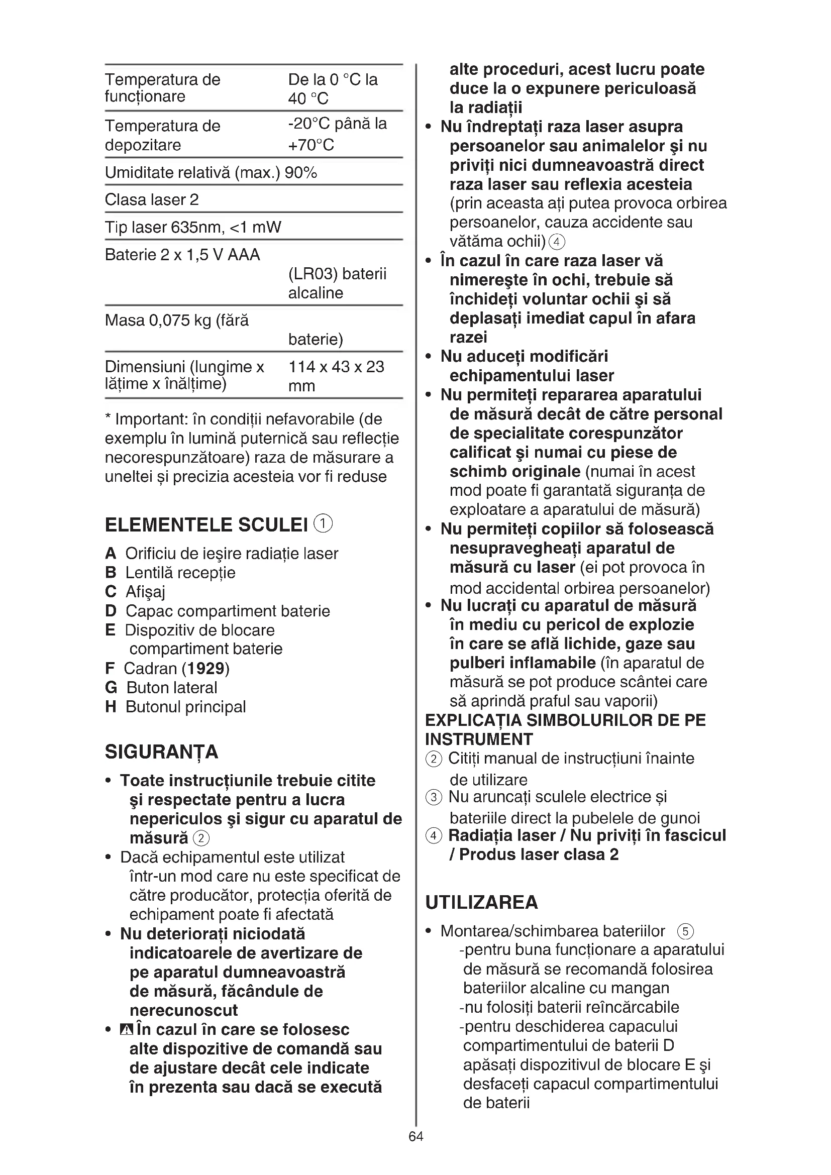- pentru buna funcţionare a aparatului de măsură se recomandă folosirea bateriilor alcaline cu mangan - nu folosiţi baterii reîncărcabile - pentru deschiderea capacului compartimentului de baterii D apăsaţi dispozitivul de blocare E şi desfaceţi capacul compartimentului de baterii Temperatura de funcţionare De la 0 °C la 40 °C Temperatura de depozitare -20°C până la +70°C Umiditate relativă (max.) 90% Clasa laser 2 Tip laser 635nm, <1 mW Baterie 2 x 1,5 V AAA (LR03) baterii alcaline Masa 0,075 kg (fără baterie) Dimensiuni (lungime x lăţime x înălţime) 114 x 43 x 23