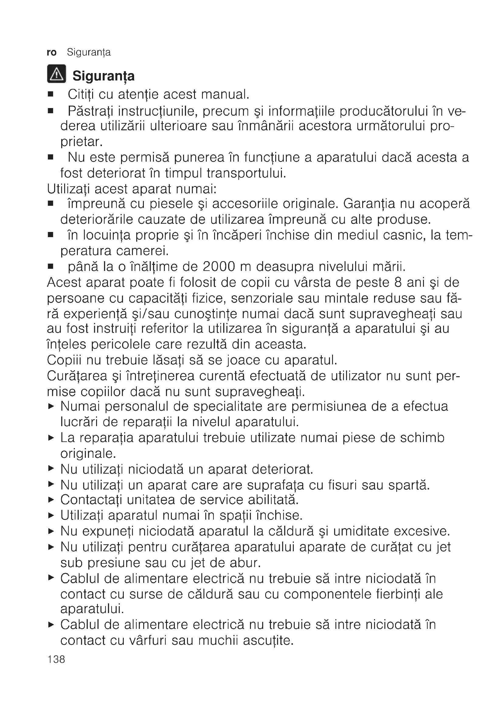 Siguranţa ¡ Citiţi cu atenţie acest manual. ¡ Păstraţi instrucţiunile, precum şi informaţiile producătorului în ve- derea utilizării ulterioare sau înmânării acestora următorului pro- prietar. ¡ Nu este permisă punerea în funcţiune a aparatului dacă acesta a fost deteriorat în timpul transportului. Utilizaţi acest aparat numai: ¡ împreună cu piesele şi accesoriile originale. Garanţia nu acoperă deteriorările cauzate de utilizarea împreună cu alte produse. ¡ în locuinţa proprie şi în încăperi închise din mediul casnic, la tem- peratura camerei. ¡ până la o înălţime de 2000m deasupra nivelului mării. Acest aparat poate fi folosit de copii cu vârsta de peste 8 ani şi de persoane cu capacităţi fizice, senzoriale sau mintale reduse sau fă- ră experienţă şi/sau cunoştinţe numai dacă sunt supravegheaţi sau au fost instruiţi referitor la utilizarea în siguranţă a aparatului şi au înţeles pericolele care rezultă din aceasta. Copiii nu trebuie lăsaţi să se joace cu aparatul. Curăţarea şi întreţinerea curentă efectuată de utilizator nu sunt per- mise copiilor dacă nu sunt supravegheaţi.