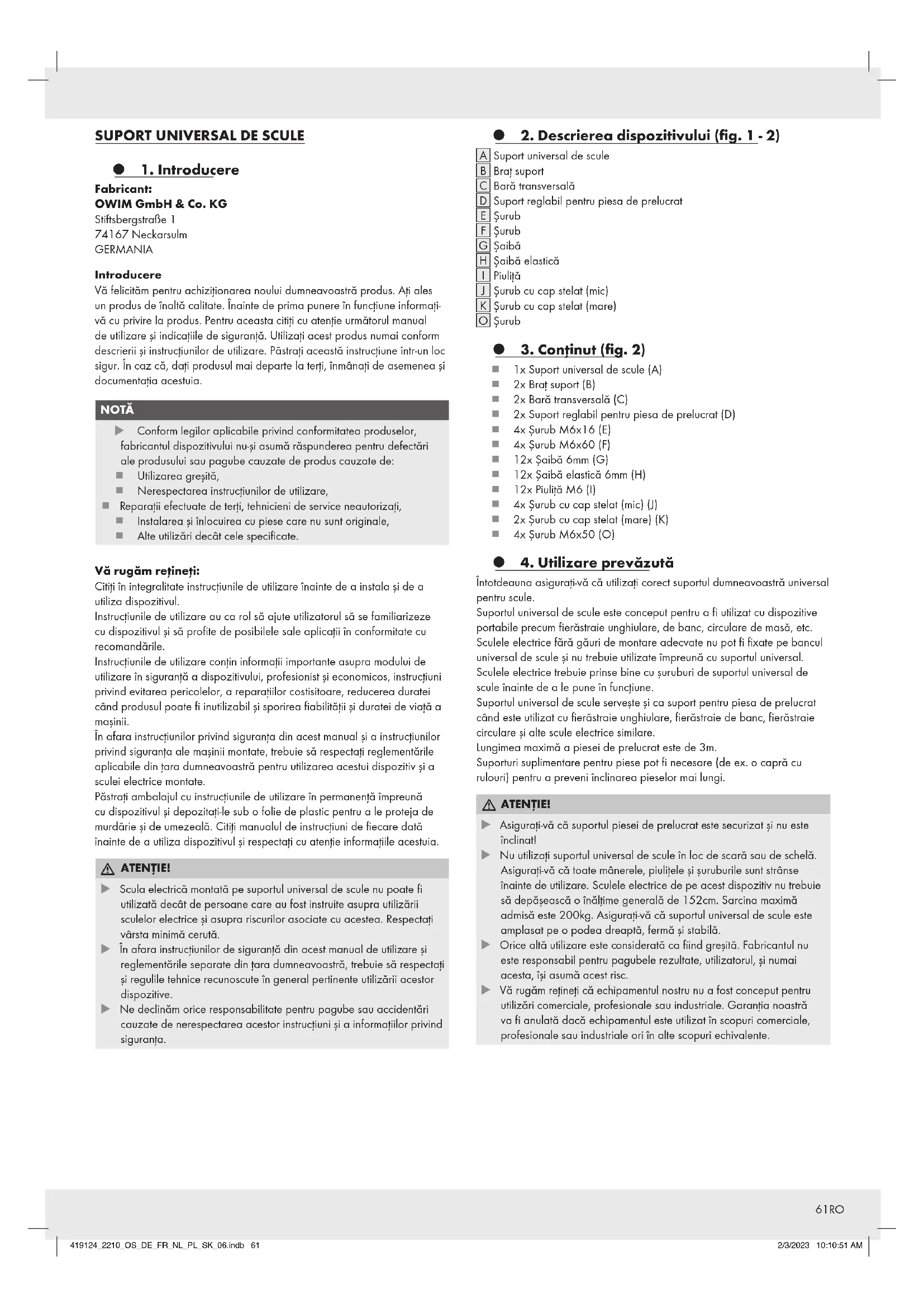 Fabricant: OWIM GmbH & Co. KG Stiftsbergstraße 1 74167 Neckarsulm GERMANIA Introducere Vă felicităm pentru achiziţionarea noului dumneavoastră produs. Aţi ales un produs de înaltă calitate. Înainte de prima punere în funcţiune informaţi- vă cu privire la produs. Pentru aceasta citiţi cu atenţie următorul manual de utilizare şi indicaţiile de siguranţă. Utilizaţi acest produs numai conform descrierii şi instrucţiunilor de utilizare. Păstraţi această instrucţiune într-un loc sigur. În caz că, daţi produsul mai departe la terţi, înmânaţi de asemenea şi documentaţia acestuia. NOTĂ u Conform legilor aplicabile privind conformitatea produselor, fabricantul dispozitivului nu-și asumă răspunderea pentru defectări ale produsului sau pagube cauzate de produs cauzate de: Utilizarea greșită, Nerespectarea instrucțiunilor de utilizare, Reparații efectuate de terți, tehnicieni de service neautorizați, Instalarea și înlocuirea cu piese care nu sunt originale, Alte utilizări decât cele specificate. Vă rugăm rețineți: Citiți în integralitate instrucțiunile de utilizare înainte de a instala și de a utiliza dispozitivul. Instrucțiunile de utilizare au ca rol să ajute utilizatorul să se familiarizeze cu dispozitivul și să profite de posibilele sale aplicații în conformitate cu recomandările. Instrucțiunile de utilizare conțin informații importante asupra modului de utilizare în siguranță a dispozitivului, profesionist și economicos, instrucțiuni privind evitarea pericolelor, a reparațiilor costisitoare, reducerea duratei când produsul poate fi inutilizabil și sporirea fiabilității și duratei de viață a mașinii. În afara instrucțiunilor privind siguranța din acest manual și a instrucțiunilor privind siguranța ale mașinii montate, trebuie să respectați reglementările aplicabile din țara dumneavoastră pentru utilizarea acestui dispozitiv și a sculei electrice montate. Păstrați ambalajul cu instrucțiunile de utilizare în permanență împreună cu dispozitivul și depozitați-le sub o folie de plastic pentru a le proteja de murdărie și de umezeală. Citiți manualul de instrucțiuni de fiecare dată înainte de a utiliza dispozitivul și respectați cu atenție informațiile acestuia.