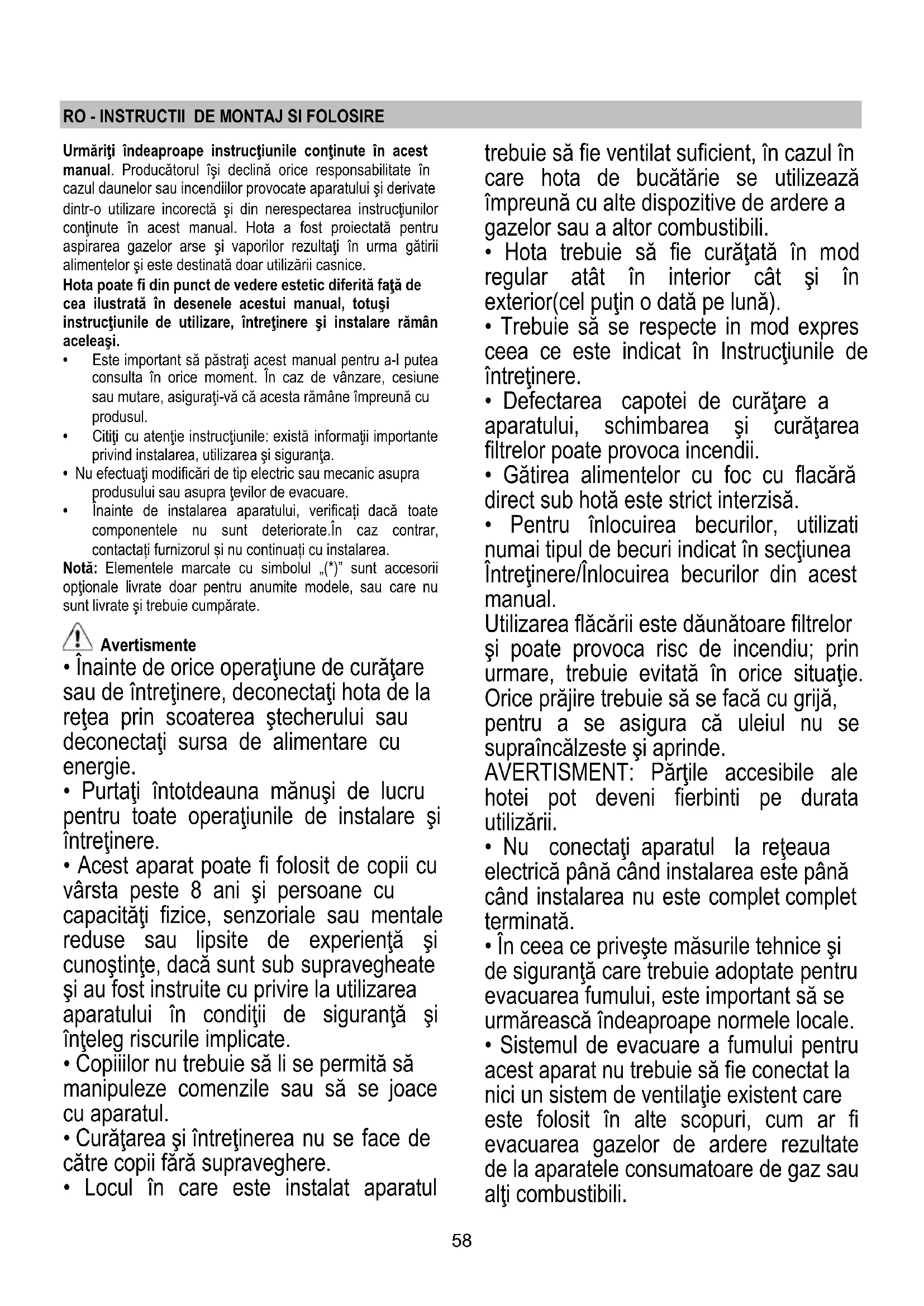 - EMC: EN 55014-1; CISPR 14-1; EN 55014-2; CISPR 14-2; EN/IEC 61000-3-2; EN/IEC 61000-3-3. Recomandări pentru o utilizare corespunzătoare în scopul reducerii impactului asupra mediului: Când începeţi să gătiţi, porniţi hota la viteză minimă şi lăsaţi-o să funcţioneze timp câteva minute după ce aţi terminat de gătit. Măriţi viteza în cazul cantităţilor mari de fum sau vapori şi utilizaţi viteza/ele sporită/e doar în cazuri extreme. Înlocuiţi filtrul/ele de carbon, atunci când este necesar, pentru a menţine o eficienţă optimă de reducere a mirosului. Curăţaţi filtrul/ele de grăsime, atunci când este necesar, pentru a menţine o eficienţă optimă a filtrului. Utilizaţi diametrul maxim al sistemului de conducte indicat în acest manual pentru a optimiza eficienţa şi pentru a reduce la minimum nivelul de zgomot. Utilizarea Hota a fost proiectată pentru aspirarea gazelor arse şi vaporilor rezultaţi în urma gătirii alimentelor şi este destinată doar utilizării casnice. Hota a fost realizată pentru a fi utilizată în versiunea aspirantă cu evacuare externă sau în versiunea filtrantă cu recirculare internă. Versiunea aspirare Vaporii sunt evacuaţi către exterior prin intermediul unui tub de evacuare fixat la flanşa de racord. ATENŢIE! Tubul de evacuare nu se furnizează din dotare; acesta trebuie achiziţionat. Diametrul tubului de evacuare trebuie să fie echivalent cu diametrul inelului de conexiune. ATENŢIE! Dacă hota este prevăzută cu filtre de carbon, acestea trebuie să fie scoase. Racordaţi hota la cablurile şi orificiile de evacuare prin perete cu diametru egal cu ieşirea aerului (flanşa de record). Utilizarea tuburilor şi orificiilor de evacuare la perete cu diametrul mai mic va determina o diminuare a prestaţiilor de aspirare şi o creştere drastică a zgomotului. Se declină însă orice responsabilitate în acest sens. ! Folosiţi un tub de lungime minimă indispensabilă.60 ! Folosiţi un tub cu un număr cât mai mic de curbe posibil (unghiul maxim al curbei: 90°). ! Evitaţi schimbările drastice de secţiune ale tubului. Versiunea cu filtrare Aerul aspirat va fi degresat şi dezodorizat înainte de a fi reintrodus în cameră. Pentru a utiliza hota în această versiune este necesar să instalaţi un sistem de filtrare suplimentar pe bază de carbon activ.