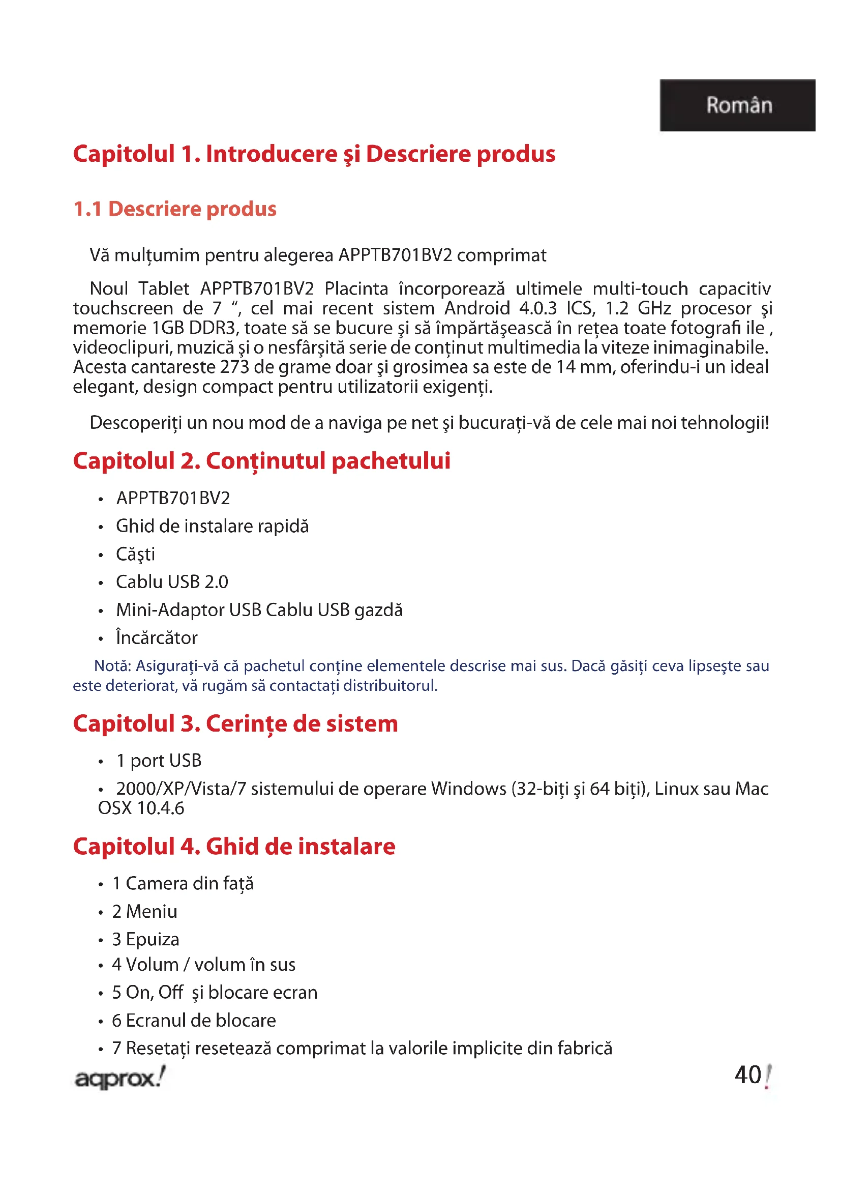 Vă mulţumim pentru alegerea APPTB701BV2 comprimat Noul Tablet APPTB701BV2 Placinta încorporează ultimele multi-touch capacitiv touchscreen de 7 “, cel mai recent sistem Android 4.0.3 ICS, 1.2 GHz procesor şi memorie 1GB DDR3, toate să se bucure şi să împărtăşească în reţea toate fotogra ile , videoclipuri, muzică şi o nesfârşită serie de conţinut multimedia la viteze inimaginabile. Acesta cantareste 273 de grame doar şi grosimea sa este de 14 mm, oferindu-i un ideal elegant, design compact pentru utilizatorii exigenţi. Descoperiţi un nou mod de a naviga pe net şi bucuraţi-vă de cele mai noi tehnologii! Capitolul 2. Conţinutul pachetului