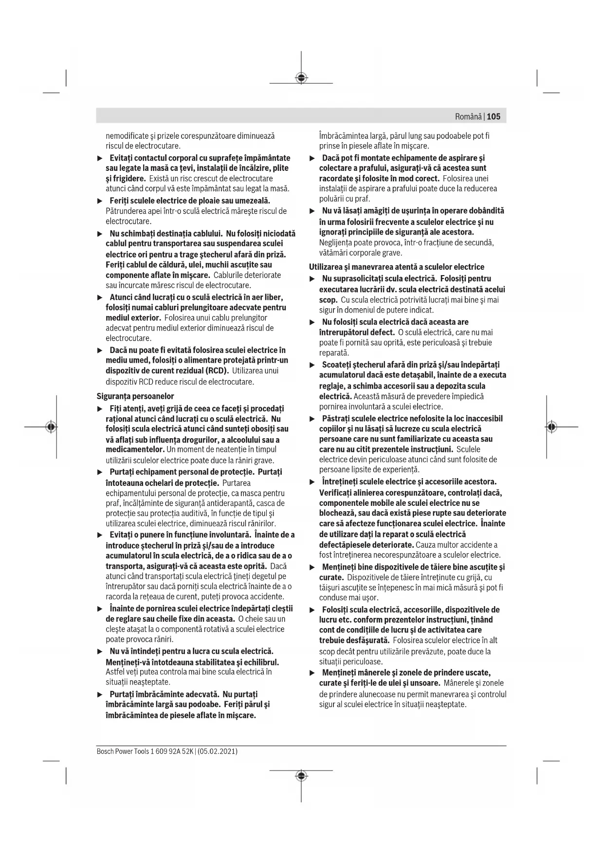 – электр құралына артық жүктеме түскеннен орын алған ақаулар. (Құралға артық жүктеме түсудің шартсыз белгілеріне мыналар жатады: құбылу түсінің пайда болуы немесе электр құралы бөліктері мен түйіндерінің деформациясы немесе қорытылуы, жоғары температура әсерінен электр қозғалтқышындағы сымдар оқшаулағышының қараюы немесе көмірленуі.) Кәдеге жарату Электр құралдар, жабдықтар және бумаларын айналаны қорғайтын кәдеге жаратуға апару қажет. Электр құралдарды үй қоқысына тастамаңыз! Тек қана ЕО елдері үшін: Электр және электрондық ескі құралдар бойынша Еуропа 2012/19/EU ережесі және ұлттық заңдарға сайкес пайдалануға жарамсыз электр құралдары бөлек жиналып, кәдеге жаратылуы қажет. Română Instrucţiuni de siguranţă Instrucţiuni generale de siguranţă pentru scule electrice AVERTIS- MENT Citiţi toate avertizările, instrucţiunile, ilustraţiile şi specificaţiile puse la dispoziţie împreună cu această sculă electrică. Nerespectarea instrucţiunilor menţionate mai jos poate duce la electrocutare, incendiu şi/sau vătămări corporale grave. Păstraţi toate indicaţiile de avertizare şi instrucţiunile în vederea utilizărilor viitoare. Termenul "sculă electrică" folosit în indicaţiile de avertizare se referă la sculele electrice alimentate de la reţea (cu cablu de alimentare) sau la sculele electrice cu acumulator (fără cablu de alimentare). Siguranţa la locul de muncă u Menţineţi‑vă sectorul de lucru curat şi bine iluminat. Dezordinea sau sectoarele de lucru neluminate pot duce la accidente. u Nu lucraţi cu sculele electrice în mediu cu pericol de explozie, în care există lichide, gaze sau pulberi inflamabile. Sculele electrice generează scântei care pot aprinde praful sau vaporii. u Nu permiteţi accesul copiilor şi al spectatorilor în timpul utilizării sculei electrice. Dacă vă este distrasă atenţia puteţi pierde controlul. Siguranţă electrică u Ştecherul sculei electrice trebuie să fie potrivit prizei electrice. Nu modificaţi niciodată ştecherul. Nu folosiţi fişe adaptoare la sculele electrice cu împământare (legate la masă). Ştecherele 1 609 92A 52K | (05.02.2021) Bosch Power ToolsRomână | 105 nemodificate şi prizele corespunzătoare diminuează riscul de electrocutare. u Evitaţi contactul corporal cu suprafeţe împământate sau legate la masă ca ţevi, instalaţii de încălzire, plite şi frigidere. Există un risc crescut de electrocutare atunci când corpul vă este împământat sau legat la masă. u Feriţi sculele electrice de ploaie sau umezeală. Pătrunderea apei într‑o sculă electrică măreşte riscul de electrocutare. u Nu schimbaţi destinaţia cablului. Nu folosiţi niciodată cablul pentru transportarea sau suspendarea sculei electrice ori pentru a trage ştecherul afară din priză. Feriţi cablul de căldură, ulei, muchii ascuţite sau componente aflate în mişcare. Cablurile deteriorate sau încurcate măresc riscul de electrocutare. u Atunci când lucraţi cu o sculă electrică în aer liber, folosiţi numai cabluri prelungitoare adecvate pentru mediul exterior. Folosirea unui cablu prelungitor adecvat pentru mediul exterior diminuează riscul de electrocutare. u Dacă nu poate fi evitată folosirea sculei electrice în mediu umed, folosiţi o alimentare protejată printr-un dispozitiv de curent rezidual (RCD). Utilizarea unui dispozitiv RCD reduce riscul de electrocutare. Siguranţa persoanelor u Fiţi atenţi, aveţi grijă de ceea ce faceţi şi procedaţi raţional atunci când lucraţi cu o sculă electrică. Nu folosiţi scula electrică atunci când sunteţi obosiţi sau vă aflaţi sub influenţa drogurilor, a alcoolului sau a medicamentelor. Un moment de neatenţie în timpul utilizării sculelor electrice poate duce la răniri grave. u Purtaţi echipament personal de protecţie. Purtaţi întoteauna ochelari de protecţie. Purtarea echipamentului personal de protecţie, ca masca pentru praf, încălţăminte de siguranţă antiderapantă, casca de protecţie sau protecţia auditivă, în funcţie de tipul şi utilizarea sculei electrice, diminuează riscul rănirilor. u Evitaţi o punere în funcţiune involuntară. Înainte de a introduce ştecherul în priză şi/sau de a introduce acumulatorul în scula electrică, de a o ridica sau de a o transporta, asiguraţi‑vă că aceasta este oprită. Dacă atunci când transportaţi scula electrică ţineţi degetul pe întrerupător sau dacă porniţi scula electrică înainte de a o racorda la reţeaua de curent, puteţi provoca accidente. u Înainte de pornirea sculei electrice îndepărtaţi cleştii de reglare sau cheile fixe din aceasta. O cheie sau un cleşte ataşat la o componentă rotativă a sculei electrice poate provoca răniri. u Nu vă întindeţi pentru a lucra cu scula electrică. Menţineţi-vă întotdeauna stabilitatea şi echilibrul. Astfel veţi putea controla mai bine scula electrică în situaţii neaşteptate. u Purtaţi îmbrăcăminte adecvată. Nu purtaţi îmbrăcăminte largă sau podoabe. Feriţi părul şi îmbrăcămintea de piesele aflate în mişcare. Îmbrăcămintea largă, părul lung sau podoabele pot fi prinse în piesele aflate în mişcare. u Dacă pot fi montate echipamente de aspirare şi colectare a prafului, asiguraţi‑vă că acestea sunt racordate şi folosite în mod corect. Folosirea unei instalaţii de aspirare a praful