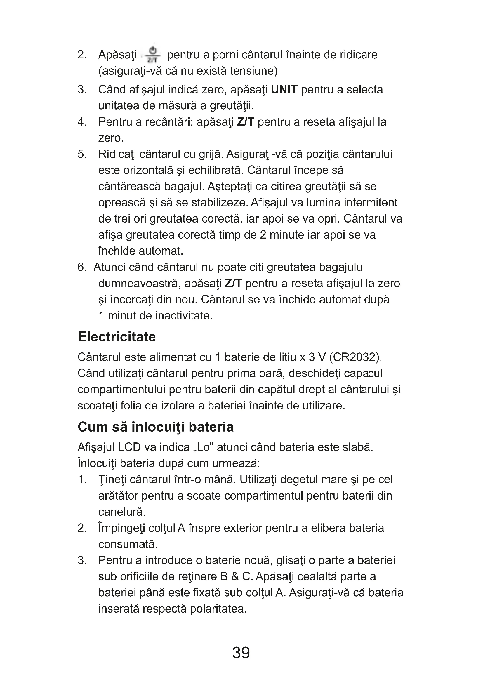 dumneavoastră, apăsaĠi Z/T pentru a re seta afiúajul la zero úi încercaĠi din nou. Cântarul se va închide automat după 1 minut de inactivitate. Electricitate Cântarul este alimentat cu 1 baterie de litiu x 3 V (CR2032). Când utilizaĠi cântarul pentru prima oară, deschideĠi capacul compartimentului pentru baterii din capătul drept al cântarului úi scoateĠi folia de izolare a bateriei înainte de utilizare. Cum să înlocuiĠi bateria Afiúajul LCD va indica „Lo” atunci când bateria este slabă. ÎnlocuiĠi bateria după cum urmează: