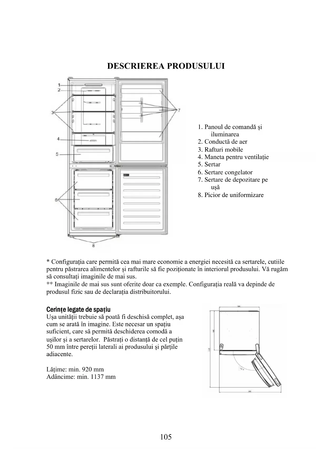 - Configurația care permită cea mai mare economie a energiei necesită ca sertarele, cutiile pentru păstrarea alimentelor și rafturile să fie poziționate în interiorul produsului. Vă rugăm să consultați imaginile de mai sus. ** Imaginile de mai sus sunt oferite doar ca exemple. Configurația reală va depinde de produsul fizic sau de declarația distribuitorului. Cerințe legate de spațiu Ușa unității trebuie să poată fi deschisă complet, așa cum se arată în imagine. Este necesar un spațiu suficient, care să permită deschiderea comodă a ușilor și a sertarelor. Păstrați o distanță de cel puțin 50 mm între pereții laterali ai produsului și părțile adiacente. Lățime: min. 920 mm Adâncime: min. 1137 mm106 Utilizarea