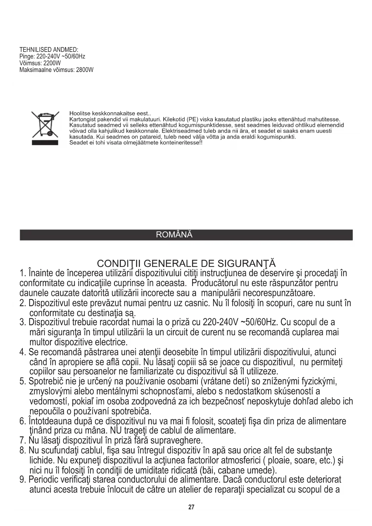 Seadet ei tohi visata olmejäätmete konteineritesse!!Kartongist pakendid vii makulatuuri. Kilekotid (PE) viska kasutatud plastiku jaoks ettenähtud mahutitesse. Kasutatud seadmed vii selleks ettenähtud kogumispunktidesse, sest seadmes leiduvad ohtlikud elemendid võivad olla kahjulikud keskkonnale. Elektriseadmed tuleb anda nii ära, et seadet ei saaks enam uuesti kasutada. Kui seadmes on patareid, tuleb need välja võtta ja anda eraldi kogumispunkti. Hoolitse keskkonnakaitse eest..ROMÂNĂ evita pericolul.