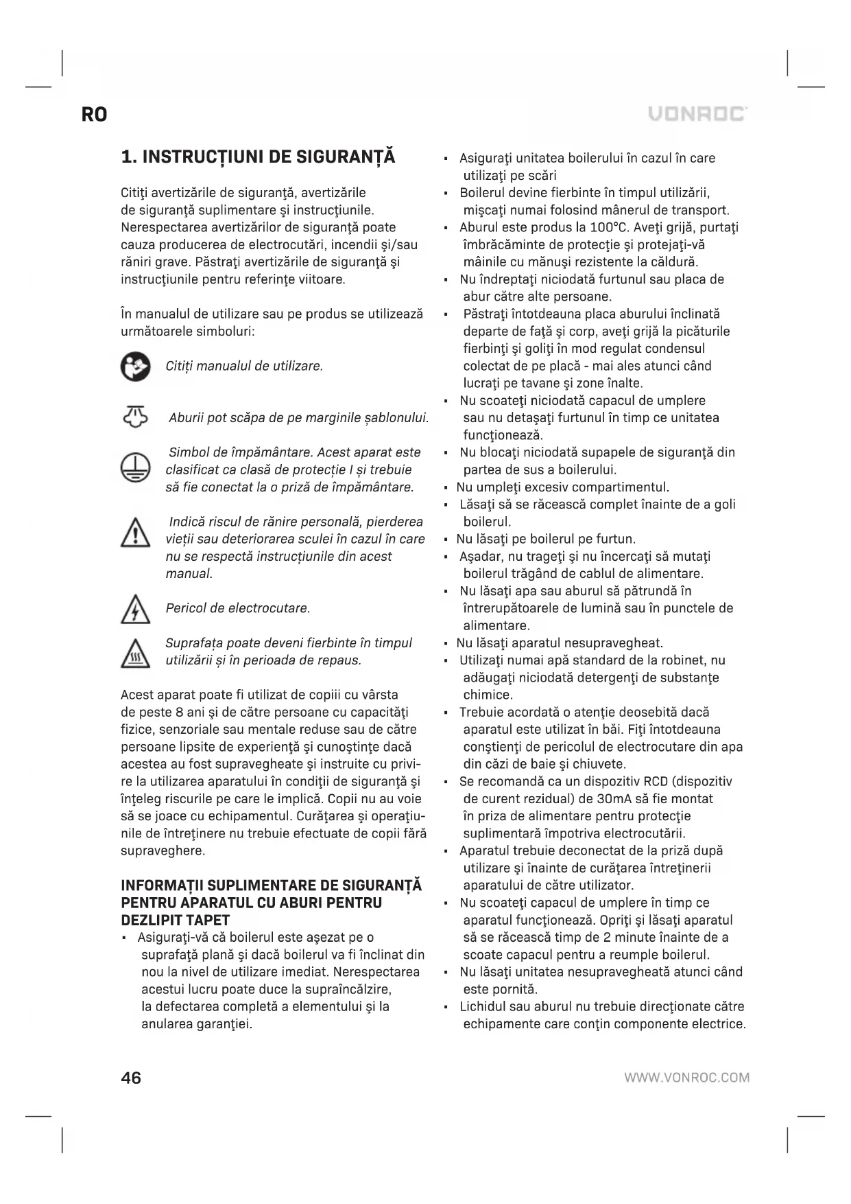 În manualul de utilizare sau pe produs se utilizează următoarele simboluri: Citiţi manualul de utilizare. Aburii pot scăpa de pe marginile șablonului. Simbol de împământare. Acest aparat este clasificat ca clasă de protecţie I și trebuie să fie conectat la o priză de împământare. Indică riscul de rănire personală, pierderea vieţii sau deteriorarea sculei în cazul în care nu se respectă instrucţiunile din acest manual. Pericol de electrocutare. Suprafaţa poate deveni fierbinte în timpul utilizării și în perioada de repaus. Acest aparat poate fi utilizat de copiii cu vârsta de peste 8 ani şi de către persoane cu capacităţi fizice, senzoriale sau mentale reduse sau de către persoane lipsite de experienţă şi cunoştinţe dacă acestea au fost supravegheate şi instruite cu privi- re la utilizarea aparatului în condiţii de siguranţă şi înţeleg riscurile pe care le implică. Copii nu au voie să se joace cu echipamentul. Curăţarea şi operaţiu- nile de întreţinere nu trebuie efectuate de copii fără supraveghere.