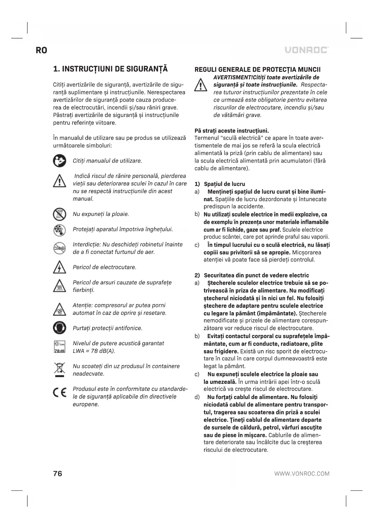 Nivelul de putere acustică garantat LWA = 78 dB(A). Nu scoateţi din uz produsul în containere neadecvate. Produsul este în conformitate cu standarde- le de siguranţă aplicabile din directivele europene.