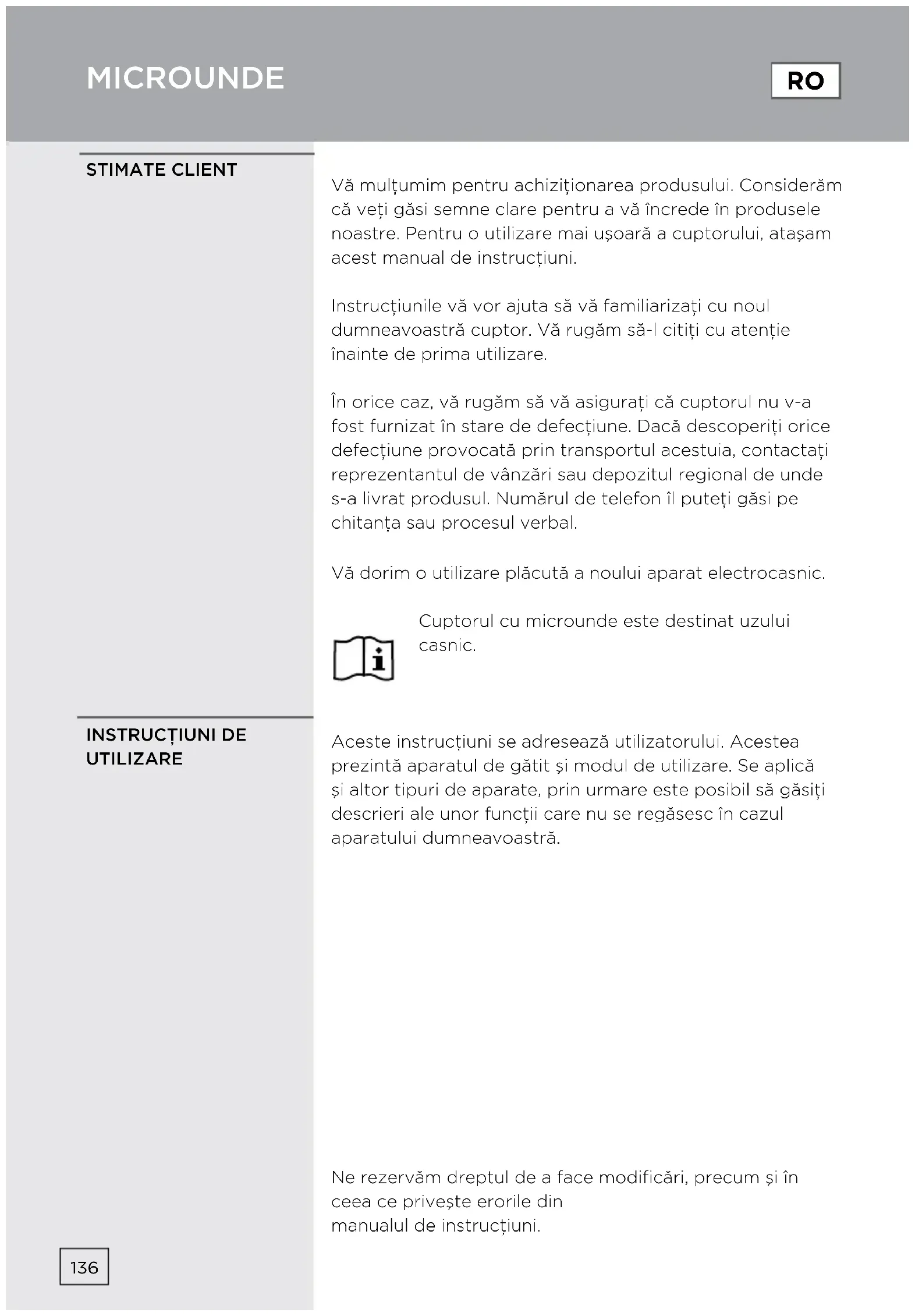 GWARANCJA I SERWIS NAPRAWCZYVă mulţumim pentru achiziţionarea produsului. Considerăm că veţi găsi semne clare pentru a vă încrede în produsele noastre. Pentru o utilizare mai uşoară a cuptorului, ataşam acest manual de instrucţiuni. Instrucţiunile vă vor ajuta să vă familiarizaţi cu noul dumneavoastră cuptor. Vă rugăm să-l citiţi cu atenţie înainte de prima utilizare. În orice caz, vă rugăm să vă asiguraţi că cuptorul nu v-a fost furnizat în stare de defecţiune. Dacă descoperiţi orice defecţiune provocată prin transportul acestuia, contactaţi reprezentantul de vânzări sau depozitul regional de unde s-a livrat produsul. Numărul de telefon îl puteţi găsi pe chitanţa sau procesul verbal. Vă dorim o utilizare plăcută a noului aparat electrocasnic. Cuptorul cu microunde este destinat uzului casnic. Aceste instrucţiuni se adresează utilizatorului. Acestea prezintă aparatul de gătit şi modul de utilizare. Se aplică şi altor tipuri de aparate, prin urmare este posibil să găsiţi descrieri ale unor funcţii care nu se regăsesc în cazul aparatului dumneavoastră. Ne rezervăm dreptul de a face modificări, precum şi în ceea ce priveşte erorile din manualul de instrucţiuni. STIMATE CLIENT