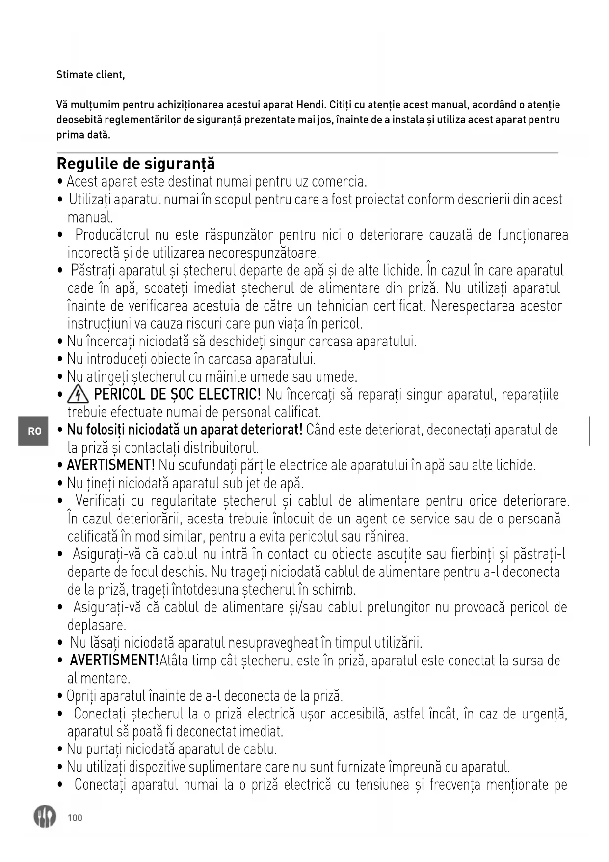 Stimate client, Vă mulțumim pentru achiziționarea acestui aparat Hendi. Citiți cu atenție acest manual, acordând o atenție deosebită reglementărilor de siguranță prezentate mai jos, înainte de a instala și utiliza acest aparat pentru prima dată. Regulile de siguranță