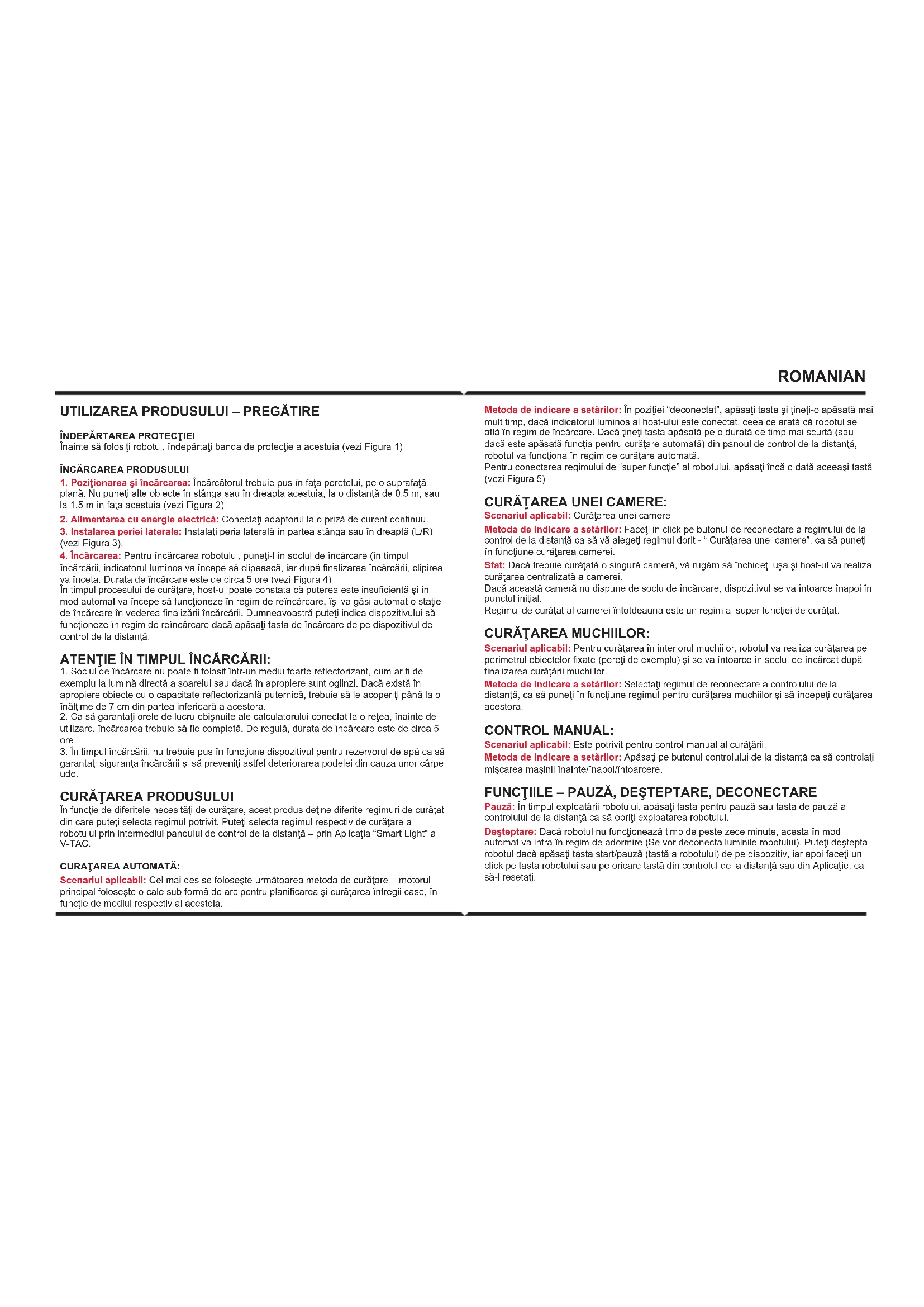 Pasul 1: Conectaţi butonul pentru alimentarea dispozitivului. Pasul 2: Scanaţi codul QR indicat sau descărcaţi-vă aplicaţia „V-TAC Smart Light” din Magazinul pentru aplicaţii (iOS) sau din Magazinul Google Play (pentru Android). Pasul 3: Deschideţi aplicaţia Smart Light a V-TAC şi apăsaţi pe butonul de înregistrare ca să vă creaţi un profil nou. Dacă deja dispuneţi de profil, vă rugăm să continuaţi spre funcţia Ieşire. (vezi Figura 31) Pasul 4: A) Numărul telefonului mobil: Selectaţi statul, introduceţi-vă apoi numărul telefonului mobil. Apăsaţi apoi pe funcţia „Următorul” (vezi Figura 32). B) E-mail: Introduceţi-vă adresa de e-mail şi apăsaţi apoi pe funcţia „Următorul” (vezi Fig 32) Pasul 5: Introduceţi-vă codul de verificare pe care noi îl vom transmite la numărul telefonului dvs. mobil/ identificatorul de e-mail, şi apoi indicaţi o parolă nouă pentru profilul dvs., după ce trebuie să apăsaţi pe funcţia „Confirm” ca să finalizaţi procesul de înregistrare (vezi Figura 33). Apoi veţi fi reorientaţi spre pagina iniţială a aplicaţiei „V-TAC Smart Light”. Pasul 6: Apăsaţi pe funcţia „Adăugarea unui dispozitiv” sau pe simbolul +. Asiguraţi-vă că dispozitivul a fost conectat. (vezi Figura 34) Pasul 7: Ca să selectaţi dispozitivul, apăsaţi pe „Aplicaţii pentru casa ta”, apoi selectaţi funcţia „Aspirator-robot”, ca să puneţi în funcţiune procesul de conectarea a dispozitivului cu Aplicaţia. (vezi Figura 35) Pasul 8: Proces de conectare A) Porniți aspiratorul apăsând o dată butonul de pornire. B) Apăsați butonul de alimentare de două ori fără întrerupere pentru a porni modul de conectare WiFi. Observaţie: Dacă apare vreo problemă cu conectarea, apăsaţi pe „Ajutor”, conform indicaţiei de mai jos, ca să obţineţi instrucţiuni suplimentare (vezi Figura 36). C) Confirmaţi dacă lumina clipeşte la intervale foarte scurte, introduceţi parola Wi-Fi şi apăsaţi pe funcţia „Confirm” (vezi Figurile 36 & 37). Pasul 9: După ce aţi finalizat cu succes operaţiunea din pasul 8, veţi fi reorientaţi către pagina „Conectare curentă”, unde Aplicaţia caută, înregistrează şi pune în funcţiune dispozitivul (vezi Figura 38). După finalizarea procesului, dispozitivul dvs. va fi conectat. Pasul 10: După conectarea cu succes a dispozitivului, puneţi o nouă denumire a acestuia, în funcţie de preferinţele dvs. Apăsaţi apoi pe funcţia „Finalizat” (vezi Figura 39). Pasul 11: Puteţi exercita control asupra dispozitivului dvs. cu ajutorul Aplicaţiei. Apăsaţi pe numele dispozitivului din prima pagină a aplicaţiei ca să intraţi în mecanismele de control şi în funcţiile dispozitivului. (vezi Figura 40) ROMANIANUKLIZENÍ JEDNOHO POKOJE: Použitelný scénář: Vyčistění jednoho pokoje Metoda pro zadaní nastavení: Klepněte na tlačítko přepnutí režimu dálkového ovládání aby jste vybrali režim Čištění jednoho pokoje a začnete čistit jeden pokoj. Rada: Při čištění pouze jedné místnosti zavřete dveře a hostitel provede centrální čištění v místnosti Pokud tato místnost nemá hnízdo pro nabíjení, zařízení se vrátí do původního místa. Řežím čištění jednoho pokoje je vždy řežím funkce pro super čištění. ČIŠTĚNÍ HRAN: Použitelný scénář: Pro vnitřní čištění hran, robot čistí obvod pevných předmětů (např. stěny) a po ukončení čištění hran se vrací do hnízda pro nabíjení. Metoda pro zadaní nastavení: Vyberte režim přepínání dálkového ovládání a vyberte režim čištění hran, abyste mohli začít čištění hran. RUČNÍ OVLÁDÁNÍ: Použitelný scénář: Vhodné pro ruční ovládaní čištění. Metoda pro zadaní nastavení: Stiskněte tlačítko dálkového ovládání pro ovládání pohybu stroje dopředu a dozadu a její obrácení.