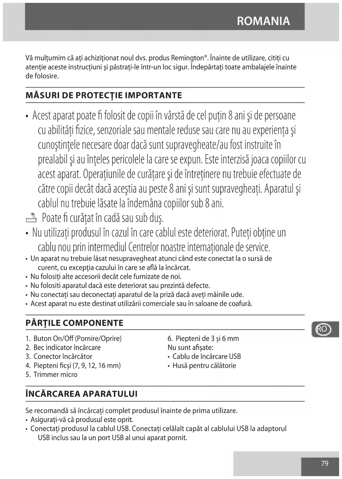 Vă mulţumim că aţi achiziţionat noul dvs. produs Remington®. Înainte de utilizare, citiţi cu atenţie aceste instrucţiuni şi păstraţi-le într-un loc sigur. Îndepărtaţi toate ambalajele înainte de folosire.