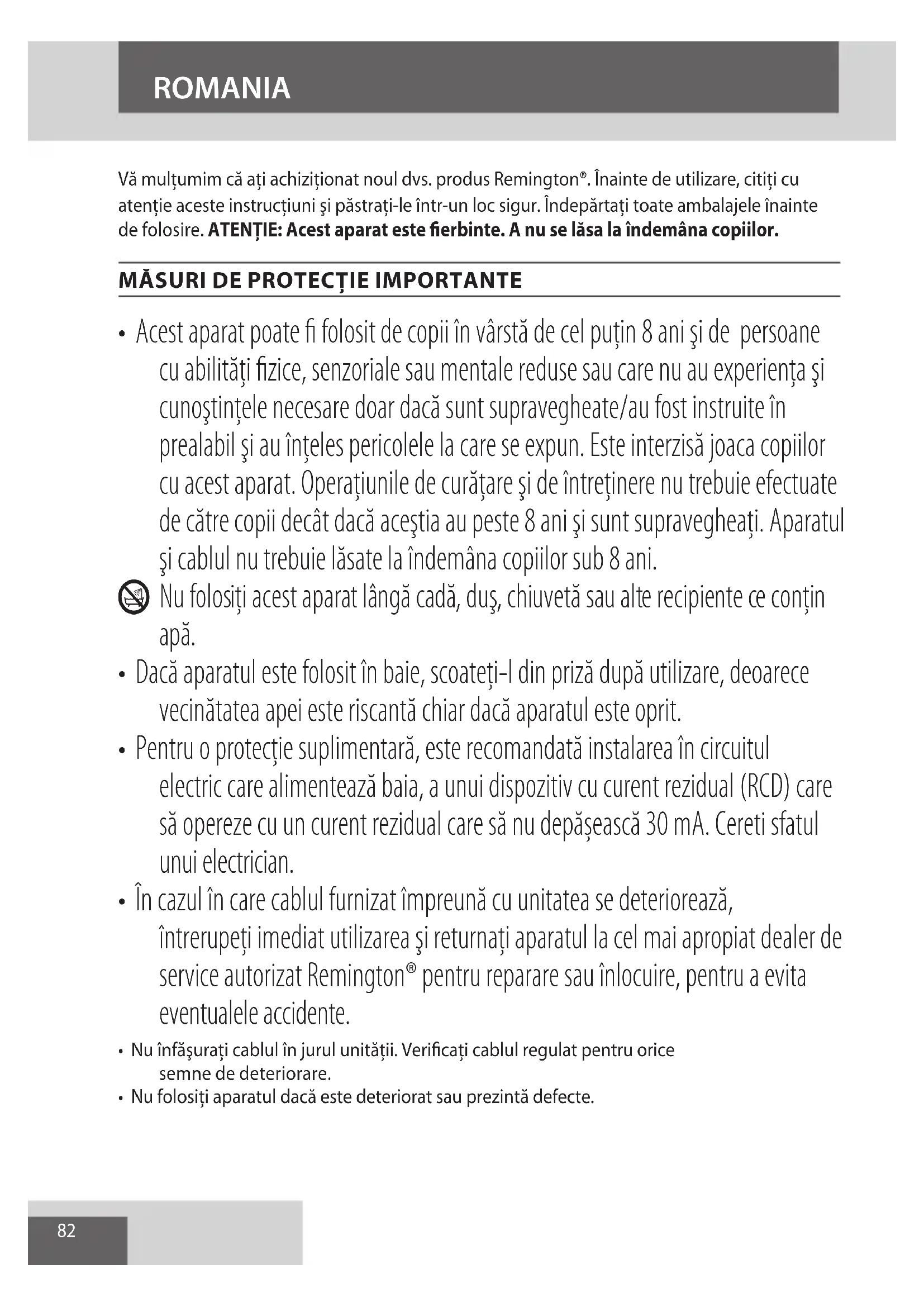 - În cazul în care cablul furnizat împreună cu unitatea se deteriorează, întrerupeţi imediat utilizarea şi returnaţi aparatul la cel mai apropiat dealer de service autorizat Remington® pentru reparare sau înlocuire, pentru a evita eventualele accidente.