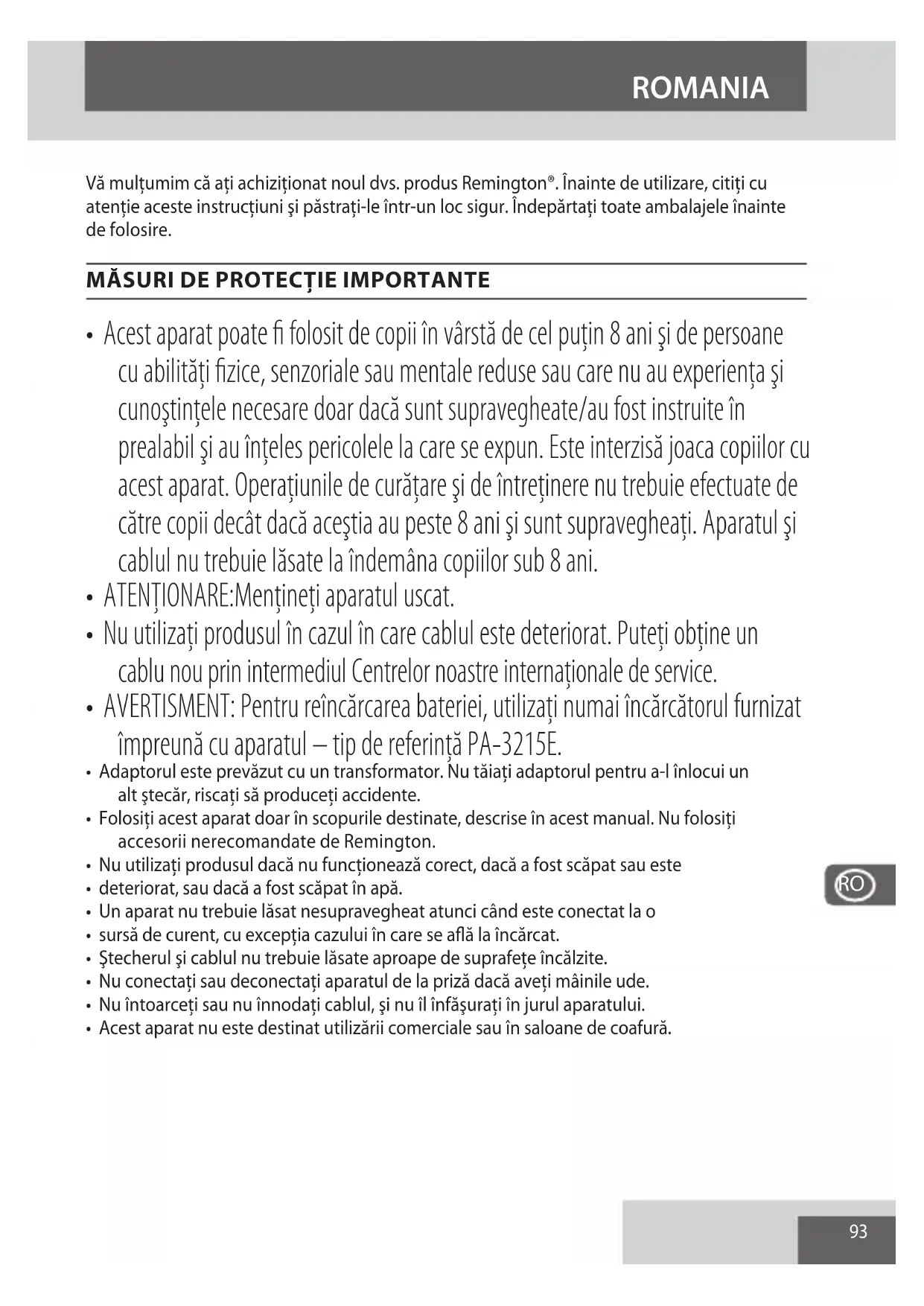 ROMANIA Vă mulţumim că aţi achiziţionat noul dvs. produs Remington®. Înainte de utilizare, citiţi cu atenţie aceste instrucţiuni şi păstraţi-le într-un loc sigur. Îndepărtaţi toate ambalajele înainte de folosire.