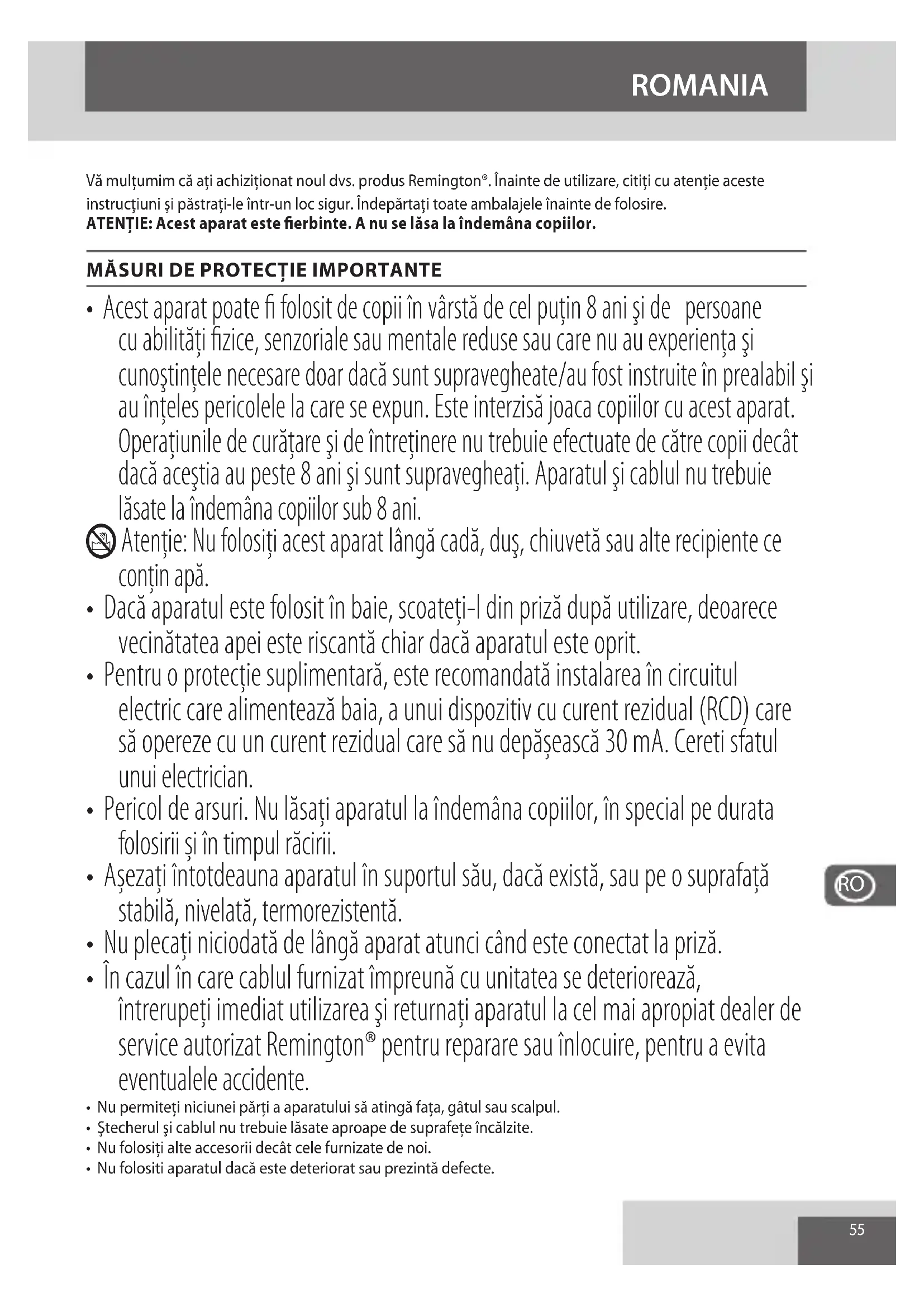 - În cazul în care cablul furnizat împreună cu unitatea se deteriorează, întrerupeţi imediat utilizarea şi returnaţi aparatul la cel mai apropiat dealer de service autorizat Remington® pentru reparare sau înlocuire, pentru a evita eventualele accidente.