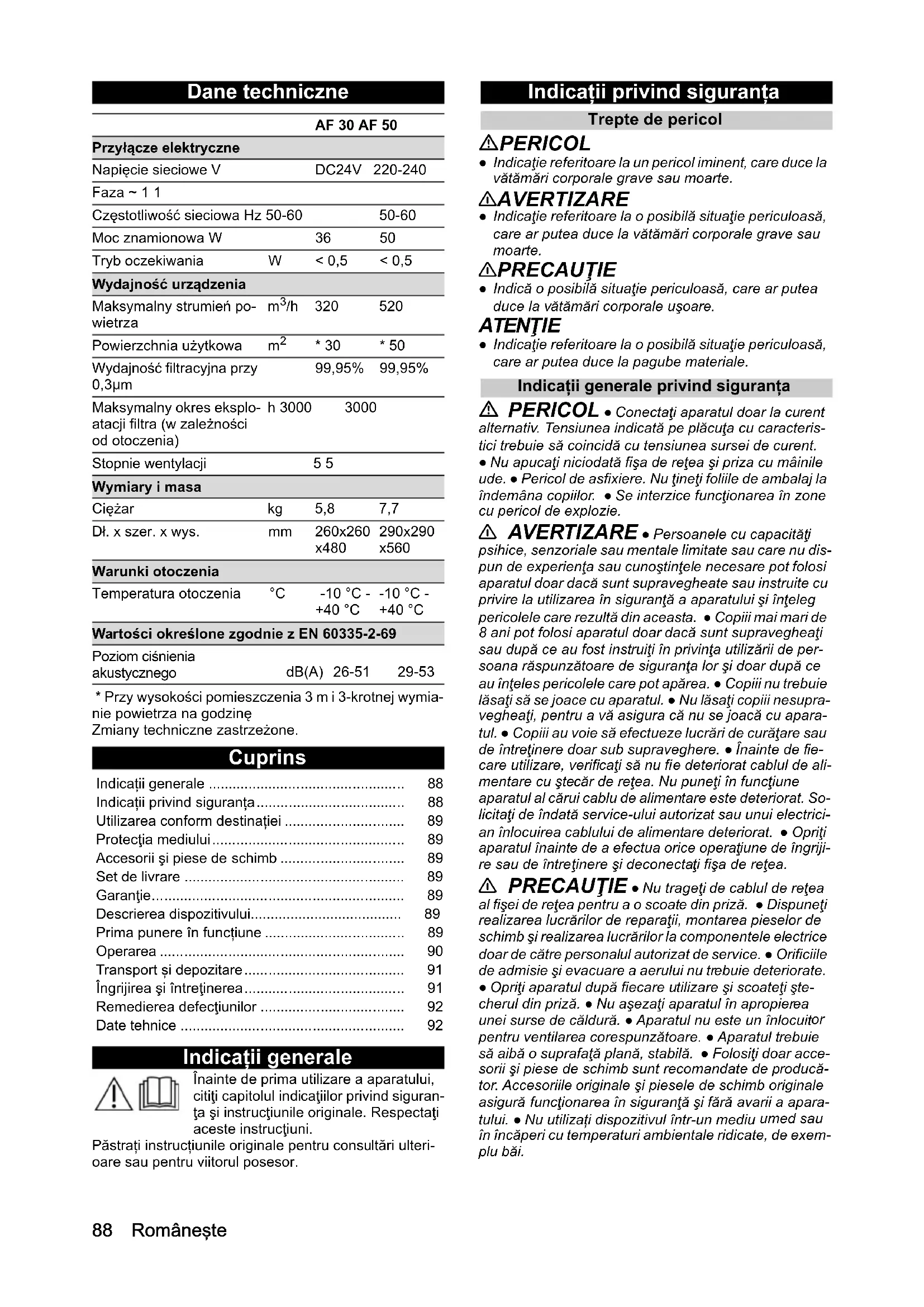 - 30 * 50 Wydajność filtracyjna przy 0,3μm 99,95% 99,95% Maksymalny okres eksplo- atacji filtra (w zależności od otoczenia) h 3000 3000 Stopnie wentylacji 5 5 Wymiary i masa Ciężar kg 5,8 7,7 Dł. x szer. x wys. mm 260x260 x480 290x290 x560 Warunki otoczenia Temperatura otoczenia °C -10 °C - +40 °C -10 °C - +40 °C Wartości określone zgodnie z EN 60335-2-69 dB(A) 26-51 29-53 Indicații generale ................................................. 88 Indicații privind siguranța..................................... 88 Utilizarea conform destinației .............................. 89 Protecţia mediului................................................ 89 Accesorii şi piese de schimb ............................... 89 Set de livrare ....................................................... 89 Garanţie............................................................... 89 Descrierea dispozitivului...................................... 89 Prima punere în funcțiune ................................... 89 Operarea ............................................................. 90 Transport și depozitare........................................ 91 Îngrijirea şi întreţinerea........................................ 91 Remedierea defecţiunilor .................................... 92 Date tehnice ........................................................ 92 DC24V 220-240 Poziom ciśnienia akustycznegoRomâneşte 89 Utilizarea conform destinației Utilizați dispozitivul ca purificator de aer numai în con- formitate cu descrierile și instrucțiunile privind siguranța din aceste instrucțiuni de funcționare. ● Dispozitivul este destinat pentru utilizarea ca purifi- cator de aer. ● Dispozitivul este adecvat pentru uz comercial. ● Dispozitivul este destinat exclusiv pentru utilizarea în spații interioare. Protecţia mediului Materialele de ambalare sunt reciclabile. Vă ru- găm să eliminaţi ambalajele în mod ecologic. Aparatele electrice şi electronice conţin materiale reciclabile preţioase şi, uneori, componente pre- cum baterii, acumulatoare sau uleiuri, care, în ca- zul utilizării incorecte sau al eliminării necorespunzătoare, pot reprezenta un potenţial pericol pentru sănătatea oamenilor şi pentru mediul înconjură- tor. Pentru funcţionarea corectă a aparatului, aceste componente sunt necesare. Aparatele marcate cu acest simbol nu trebuie aruncate la gunoiul menajer. Observaţii referitoare la materialele conţinute (RE- ACH) Informaţii actuale referitoare la materialele conţinute pu- teţi găsi la adresa: www.kaercher.com/REACH Accesorii şi piese de schimb Utilizaţi numai accesorii originale şi piese de schimb ori- ginale; ele asigură funcţionarea în siguranţă şi fără ava- rii a aparatului. Informaţii despre accesorii şi piesele de schimb se gă- sesc la adresa www.kaercher.com. Set de livrare Setul de livrare a aparatului este ilustrat pe ambalaj. La despachetare, verificaţi dacă conţinutul este complet. Informaţi imediat distribuitorul dacă lipsesc accesorii sau dacă există deteriorări provocate în timpul transpor- tului. Garanţie În fiecare ţară sunt valabile condiţiile de garanţie publi- cate de distribuitorul nostru din ţara respectivă. Eventu- ale defecţiuni ale acestui aparat, care survin în perioada de garanţie şi care sunt rezultatul unor defecte de fabri- caţie sau de material, vor fi remediate gratuit. Pentru a putea beneficia de garanţie, prezentaţi-vă cu chitanţa de cumpărare la magazin sau la cea mai apropiată uni- tate de service autorizată. (Pentru adresă, consultaţi pagina din spate) Descrierea dispozitivului Pentru imagini, consultați pagina de grafice. Figura A 1 Taste de comandă 2 Câmp de afișare 3 Tastă de comandă Dispozitiv pornit/oprit 4 Tastă de comandă Treaptă ventilator 5 Tastă de comandă/afișaj Mod automat pornit/oprit 6 Tastă de comandă Mod ECO pornit/oprit 7 Tastă de comandă/afișaj Mod de repaus activat/ dezactivat 8 Tas tă de comandă/afișaj Blocare funcție 9 Tas tă de comandă/afișaj Temporizator 10 Tas tă de comandă/afișaj Resetare filtru 11 Afișajul temperaturii în °C 12 Afișajul stării temporizate de pornire/oprire 13 Afișajul treptei ventilatorului 14 Afișajul indicelui de calitate a aerului PM 2,5 (afișaj numeric/color) 15 Afișajul umidității relative 16 Afișajul duratei de viață a filtrului 17 Senzor de calitate a aerului 18 Conexiune pentru bloc de alimentare AF 30 19 Cablu de conectare AF50 20 Rolă de ghidare AF50 (4x) 21 Capac filtru 22 Filtru 23 Adaptor de rețea AF30 Indicaţie Setările de funcții sunt posibile numai prin intermediul tastelor de comandă și nu prin intermediul afișajului. Prima punere în funcțiune Înainte de prima punere în funcțiune, filtrele fine deja uti- lizate în dispozitiv trebuie să fie despachetate.