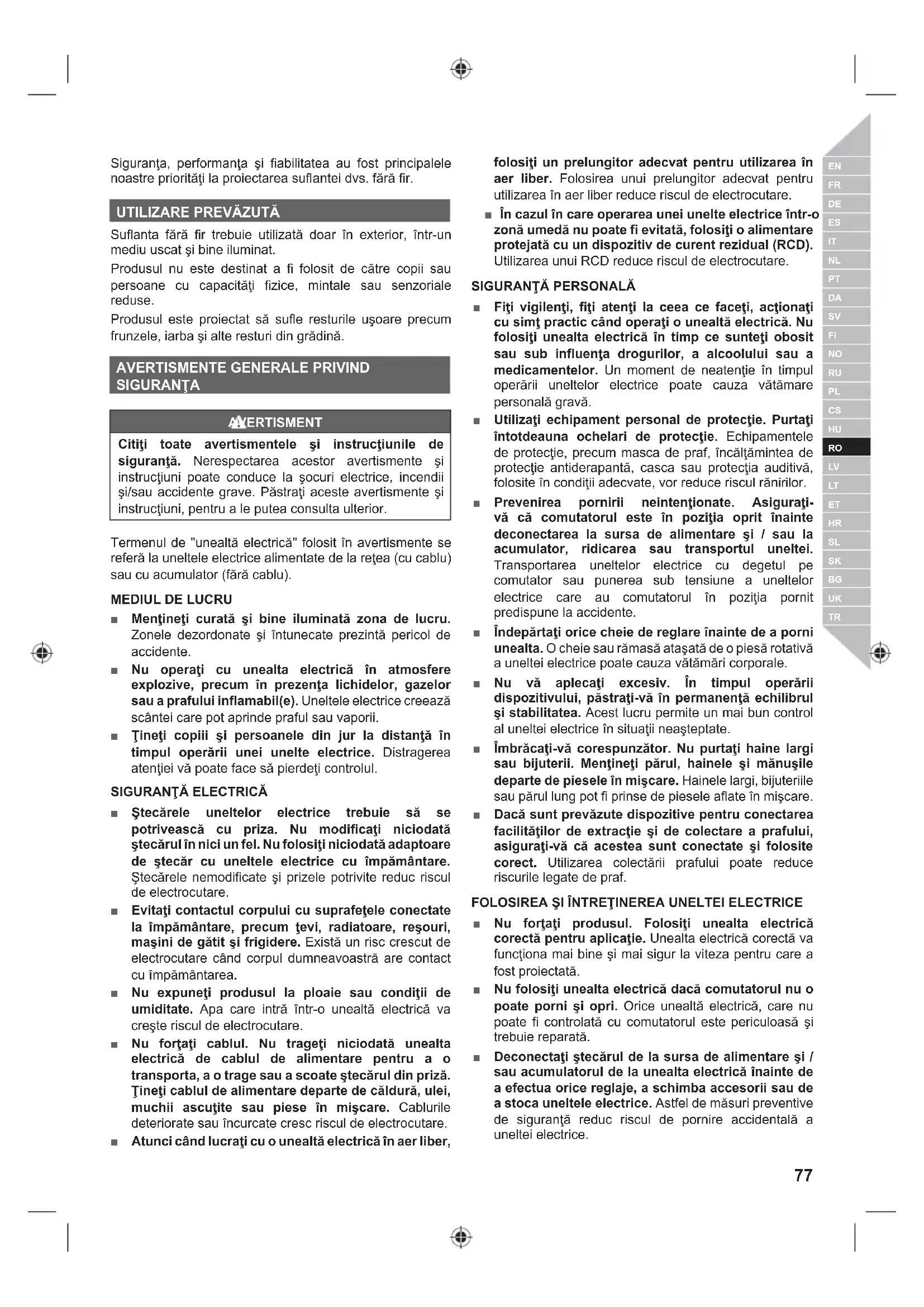 ■ Menţineţi curată şi bine iluminată zona de lucru. Zonele dezordonate şi întunecate prezintă pericol de accidente. ■ Nu operaţi cu unealta electrică în atmosfere explozive, precum în prezenţa lichidelor, gazelor sau a prafului inflamabil(e). Uneltele electrice creează scântei care pot aprinde praful sau vaporii. ■ Ţineţi copiii şi persoanele din jur la distanţă în timpul operării unei unelte electrice. Distragerea atenţiei vă poate face să pierdeţi controlul. SIGURANŢĂ ELECTRICĂ ■ Ştecărele uneltelor electrice trebuie să se potrivească cu priza. Nu modificaţi niciodată ştecărul în nici un fel. Nu folosiţi niciodată adaptoare de ştecăr cu uneltele electrice cu împământare. Ştecărele nemodificate şi prizele potrivite reduc riscul de electrocutare. ■ Evitaţi contactul corpului cu suprafeţele conectate la împământare, precum ţevi, radiatoare, reşouri, maşini de gătit şi frigidere. Există un risc crescut de electrocutare când corpul dumneavoastră are contact cu împământarea. ■ Nu expuneţi produsul la ploaie sau condiţii de umiditate. Apa care intră într-o unealtă electrică va creşte riscul de electrocutare. ■ Nu forţaţi cablul. Nu trageţi niciodată unealta electrică de cablul de alimentare pentru a o transporta, a o trage sau a scoate ştecărul din priză. Ţineţi cablul de alimentare departe de căldură, ulei, muchii ascuţite sau piese în mişcare. Cablurile deteriorate sau încurcate cresc riscul de electrocutare. ■ Atunci când lucraţi cu o unealtă electrică în aer liber, folosiţi un prelungitor adecvat pentru utilizarea în aer liber. Folosirea unui prelungitor adecvat pentru utilizarea în aer liber reduce riscul de electrocutare. ■ În cazul în care operarea unei unelte electrice într-o zonă umedă nu poate fi evitată, folosiţi o alimentare protejată cu un dispozitiv de curent rezidual (RCD). Utilizarea unui RCD reduce riscul de electrocutare. SIGURANŢĂ PERSONALĂ ■ Fiţi vigilenţi, fiţi atenţi la ceea ce faceţi, acţionaţi cu simţ practic când operaţi o unealtă electrică. Nu folosiţi unealta electrică în timp ce sunteţi obosit sau sub influenţa drogurilor, a alcoolului sau a medicamentelor. Un moment de neatenţie în timpul operării uneltelor electrice poate cauza vătămare personală gravă. ■ Utilizaţi echipament personal de protecţie. Purtaţi întotdeauna ochelari de protecţie. Echipamentele de protecţie, precum masca de praf, încălţămintea de protecţie antiderapantă, casca sau protecţia auditivă, folosite în condiţii adecvate, vor reduce riscul rănirilor. ■ Prevenirea pornirii neintenţionate. Asiguraţi- vă că comutatorul este în poziţia oprit înainte deconectarea la sursa de alimentare şi / sau la acumulator, ridicarea sau transportul uneltei. Transportarea uneltelor electrice cu degetul pe comutator sau punerea sub tensiune a uneltelor electrice care au comutatorul în poziţia pornit predispune la accidente. ■ Îndepărtaţi orice cheie de reglare înainte de a porni unealta. O cheie sau rămasă ataşată de o piesă rotativă a uneltei electrice poate cauza vătămări corporale. ■ Nu vă aplecaţi excesiv. În timpul operării dispozitivului, păstraţi-vă în permanenţă echilibrul şi stabilitatea. Acest lucru permite un mai bun control al uneltei electrice în situaţii neaşteptate. ■ Îmbrăcaţi-vă corespunzător. Nu purtaţi haine largi sau bijuterii. Menţineţi părul, hainele şi mănuşile departe de piesele în mişcare. Hainele largi, bijuteriile sau părul lung pot fi prinse de piesele aflate în mişcare. ■ Dacă sunt prevăzute dispozitive pentru conectarea facilităţilor de extracţie şi de colectare a prafului, asiguraţi-vă că acestea sunt conectate şi folosite corect. Utilizarea colectării prafului poate reduce riscurile legate de praf.