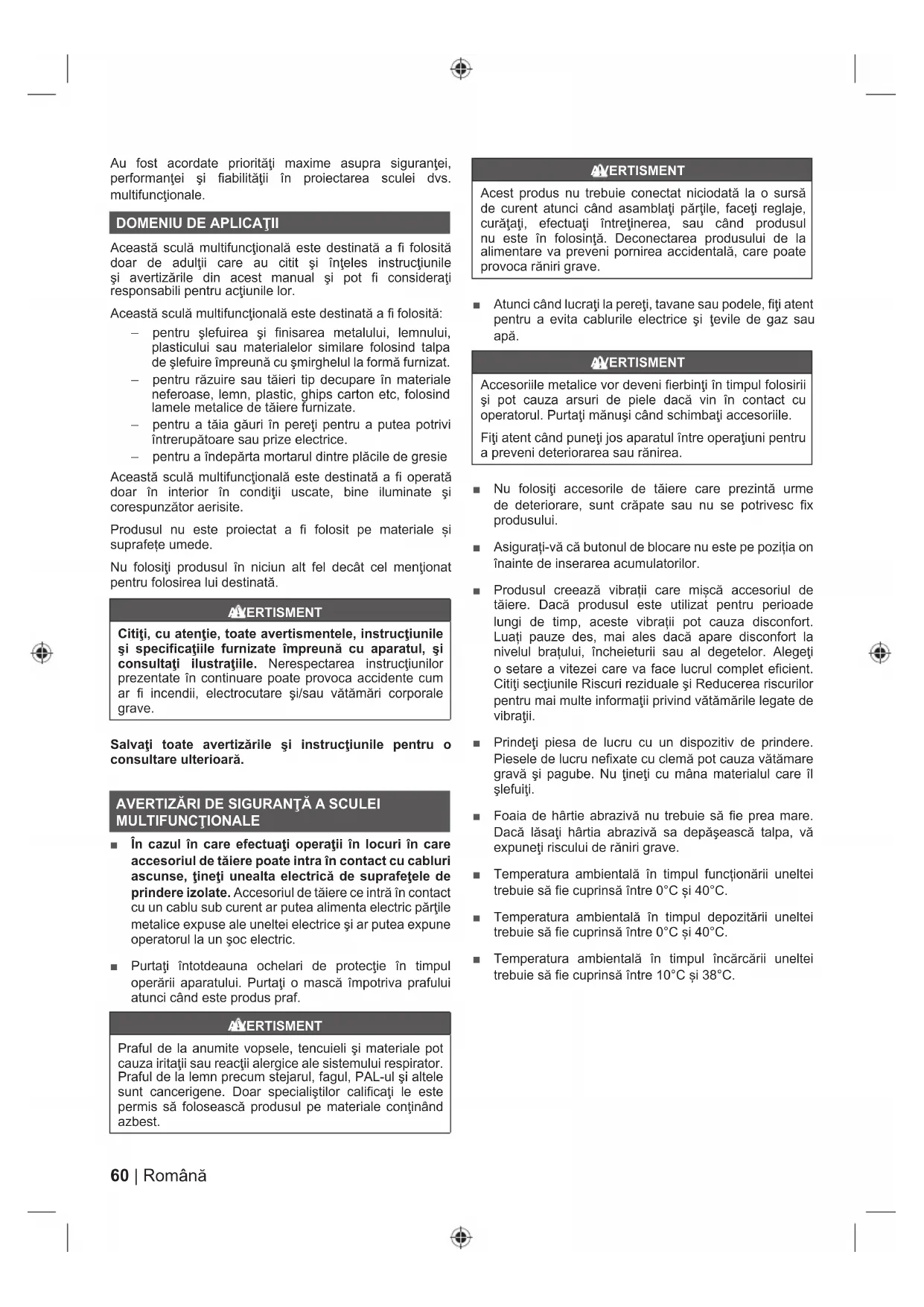 Această sculă multifuncţională este destinată a fi folosită doar de adulţii care au citit şi înţeles instrucţiunile şi avertizările din acest manual şi pot fi consideraţi responsabili pentru acţiunile lor. Această sculă multifuncţională este destinată a fi folosită: – pentru şlefuirea şi finisarea metalului, lemnului, plasticului sau materialelor similare folosind talpa de şlefuire împreună cu şmirghelul la formă furnizat. – pentru răzuire sau tăieri tip decupare în materiale neferoase, lemn, plastic, ghips carton etc, folosind lamele metalice de tăiere furnizate. – pentru a tăia găuri în pereţi pentru a putea potrivi întrerupătoare sau prize electrice. – pentru a îndepărta mortarul dintre plăcile de gresie Această sculă multifuncţională este destinată a fi operată doar în interior în condiţii uscate, bine iluminate şi corespunzător aerisite. Produsul nu este proiectat a fi folosit pe materiale și suprafețe umede. Nu folosiţi produsul în niciun alt fel decât cel menţionat pentru folosirea lui destinată. AVERTISMENT Citiţi, cu atenţie, toate avertismentele, instrucţiunile şi specificaţiile furnizate împreună cu aparatul, şi consultaţi ilustraţiile. Nerespectarea instrucţiunilor prezentate în continuare poate provoca accidente cum ar fi incendii, electrocutare şi/sau vătămări corporale grave. Salvaţi toate avertizările şi instrucţiunile pentru o consultare ulterioară.