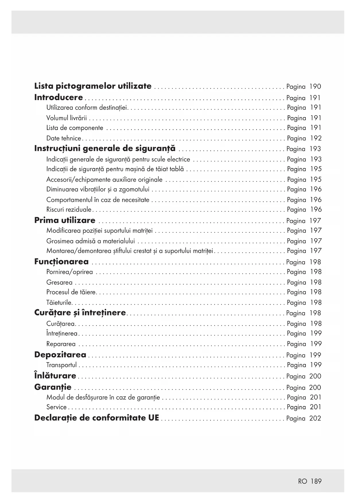 Lista pictogramelor utilizate ...................................... Pagina 190 Introducere .......................................................... Pagina 191 Utilizarea conform destinației.............................................. Pagina 191 Volumul livrării ......................................................... Pagina 191 Lista de componente .................................................... Pagina 191 Date tehnice........................................................... Pagina 192 Instrucțiuni generale de siguranță ............................... Pagina 193 Indicații generale de siguranță pentru scule electrice ........................... Pagina 193 Indicaţii de siguranţă pentru mașină de tăiat tablă ............................. Pagina 195 Accesorii/echipamente auxiliare originale ................................... Pagina 195 Diminuarea vibrațiilor și a zgomotului ....................................... Pagina 196 Comportamentul în caz de necesitate ....................................... Pagina 196 Riscuri reziduale........................................................ Pagina 196 Prima utilizare ...................................................... Pagina 197 Modificarea poziției suportului matriței ...................................... Pagina 197 Grosimea admisă a materialului ........................................... Pagina 197 Montarea/demontarea știftului crestat și a suportului matriței..................... Pagina 197 Funcționarea ........................................................ Pagina 198 Pornirea/oprirea ....................................................... Pagina 198 Gresarea ............................................................. Pagina 198 Procesul de tăiere....................................................... Pagina 198 Tăieturile.............................................................. Pagina 198 Curățare și întreținere.............................................. Pagina 198 Curățarea............................................................. Pagina 198 Întreținerea............................................................ Pagina 199 Repararea ............................................................ Pagina 199 Depozitarea . . . . . . . . . . . . . . . . . . . . . . . . . . . . . . . . . . . . . . . . . . . . . . . . . . . . . . . . . Pagina 199 Transportul ............................................................ Pagina 199 Înlăturare ............................................................ Pagina 200 Garanție ............................................................. Pagina 200 Modul de desfășurare în caz de garanție .................................... Pagina 201 Service ............................................................... Pagina 201 Declarație de conformitate UE .................................... Pagina 202190