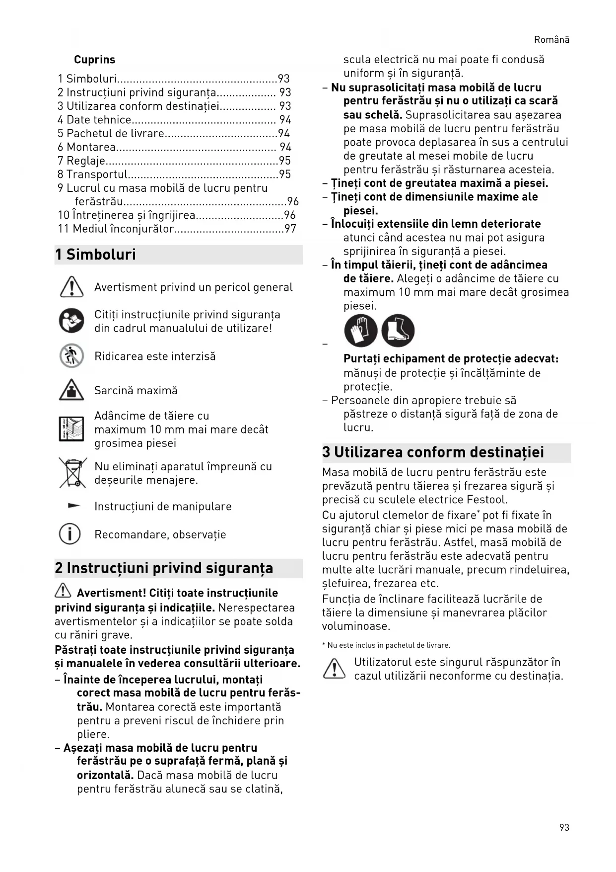 Purtaţi echipament de protecţie adecvat: mănuşi de protecţie şi încălţăminte de protecţie. – Persoanele din apropiere trebuie să păstreze o distanţă sigură faţă de zona de lucru. 3 Utilizarea conform destinaţiei Masa mobilă de lucru pentru ferăstrău este prevăzută pentru tăierea şi frezarea sigură şi precisă cu sculele electrice Festool. Cu ajutorul clemelor de fixare