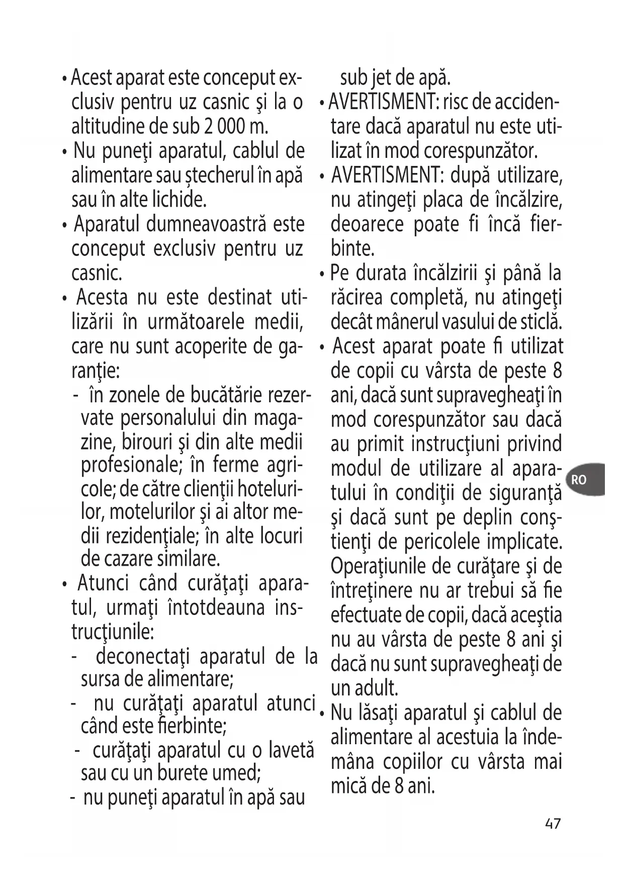 - În cazul în care cablul de ali- mentare este deteriorat, nu utilizaţi aparatul. Pentru a evita orice pericol, returnaţi imediat aparatul la producător, la ser- viciul post-vanzare sau la alte persoane calicate pentru a înlocui cablul.47