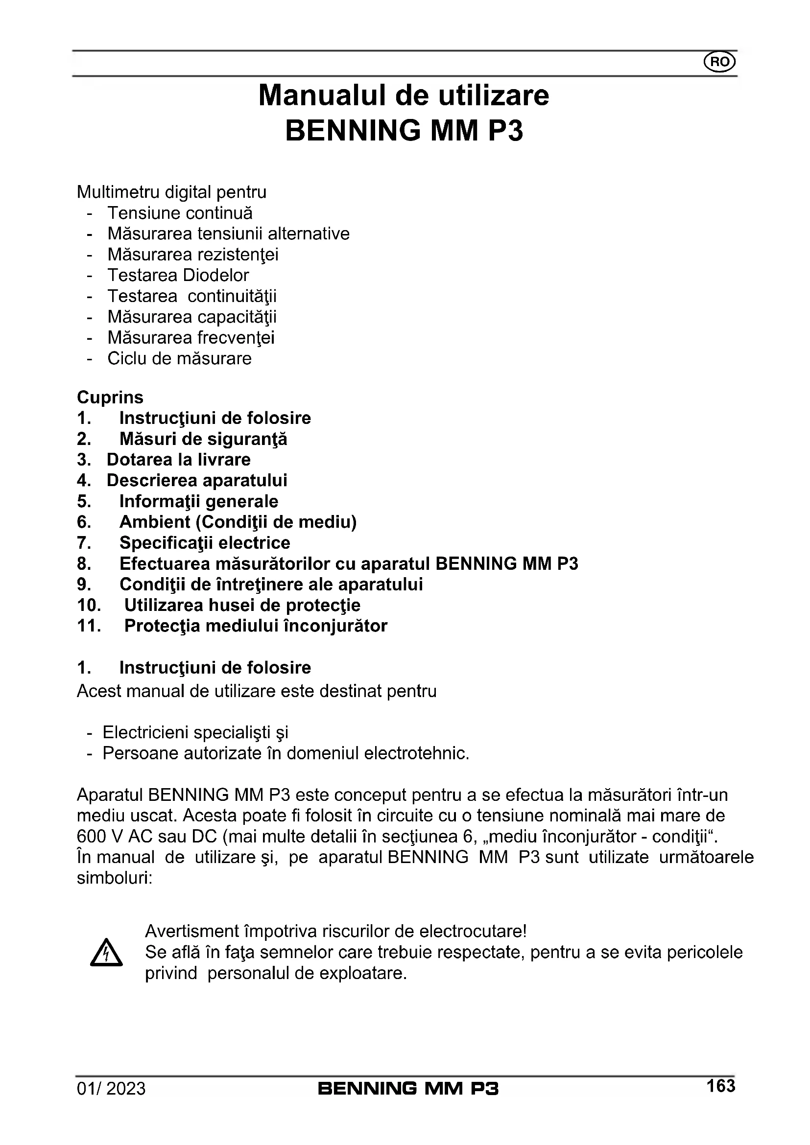 Asigurati-va ca înainte de a deschide aparatul BENNING MM P3 acesta este deconectat de la tensiune! Pericol electric! Lucrul la aparatul BENNING MM P3 deschis aat sub tensiune, este rezervat ex-01/ 2023
