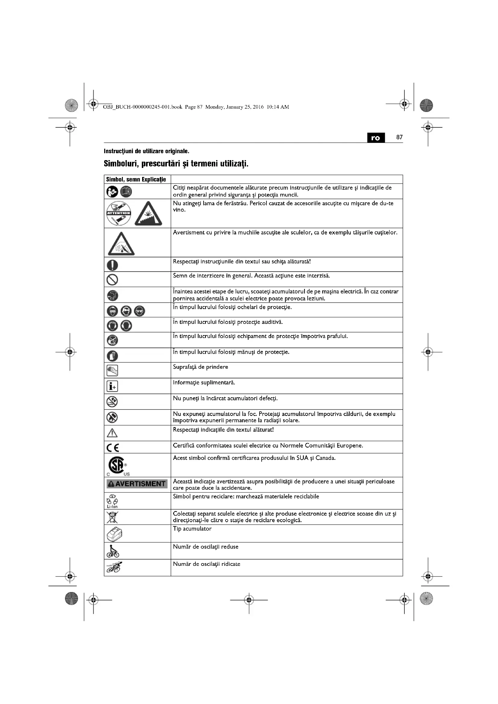 Instrucţiuni de utilizare originale. Simboluri, prescurtări şi termeni utilizaţi. Simbol, semn Explicaţie Citiţi neapărat documentele alăturate precum instrucţiunile de utilizare şi indicaţiile de ordin general privind siguranţa şi potecţia muncii. Nu atingeţi lama de ferăstrău. Pericol cauzat de accesoriile ascuţite cu mişcare de du-te vino. Avertisment cu privire la muchiile ascuţite ale sculelor, ca de exemplu tăişurile cuţitelor. Respectaţi instrucţiunile din textul sau schiţa alăturată! Semn de interzicere în general. Această acţiune este interzisă. Înaintea acestei etape de lucru, scoateţi acumulatorul de pe maşina electrică. În caz contrar pornirea accidentală a sculei electrice poate provoca leziuni. În timpul lucrului folosiţi ochelari de protecţie. În timpul lucrului folosiţi protecţie auditivă. În timpul lucrului folosiţi echipament de protecţie împotriva prafului. În timpul lucrului folosiţi mănuşi de protecţie. Suprafaţă de prindere Informaţie suplimentară. Nu puneţi la încărcat acumulatori defecţi. Nu expuneţi acumulatorul la foc. Protejaţi acumulatorul împotriva căldurii, de exemplu împotriva expunerii permanente la radiaţii solare. Respectaţi indicaţiile din textul alăturat! Certifică conformitatea sculei electrice cu Normele Comunităţii Europene. Acest simbol confirmă certificarea produsului în SUA şi Canada. Această indicaţie avertizează asupra posibilităţii de producere a unei situaţii periculoase care poate duce la accidentare. Simbol pentru reciclare: marchează materialele reciclabile Colectaţi separat sculele electrice şi alte produse electronice şi electrice scoase din uz şi direcţionaţi-le către o staţie de reciclare ecologică. Tip acumulator Număr de oscilaţii reduse Număr de oscilaţii ridicate OBJ_BUCH-0000000245-001.book Page 87 Monday, January 25, 2016 10:14 AM88