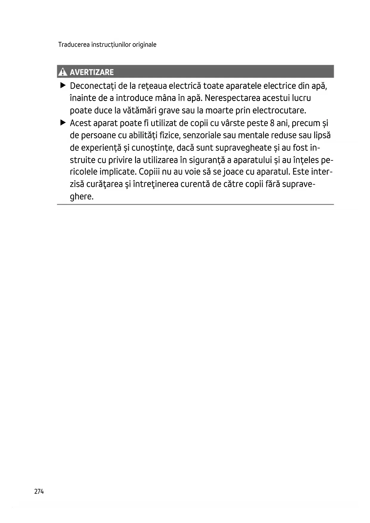 AVERTI ZARE AVERTIZARE Deconectați de la rețeaua electrică toate aparatele electrice din apă, înainte de a introduce mâna în apă. Nerespectarea acestui lucru poate duce la vătămări grave sau la moarte prin electrocutare. Acest aparat poate fi utilizat de copii cu vârste peste 8 ani, precum și de persoane cu abilități fizice, senzoriale sau mentale reduse sau lipsă de experiență și cunoștințe, dacă sunt supravegheate și au fost in- struite cu privire la utilizarea în siguranță a aparatului și au înțeles pe- ricolele implicate. Copiii nu au voie să se joace cu aparatul. Este inter- zisă curăţarea şi întreţinerea curentă de către copii fără suprave- ghere.RO