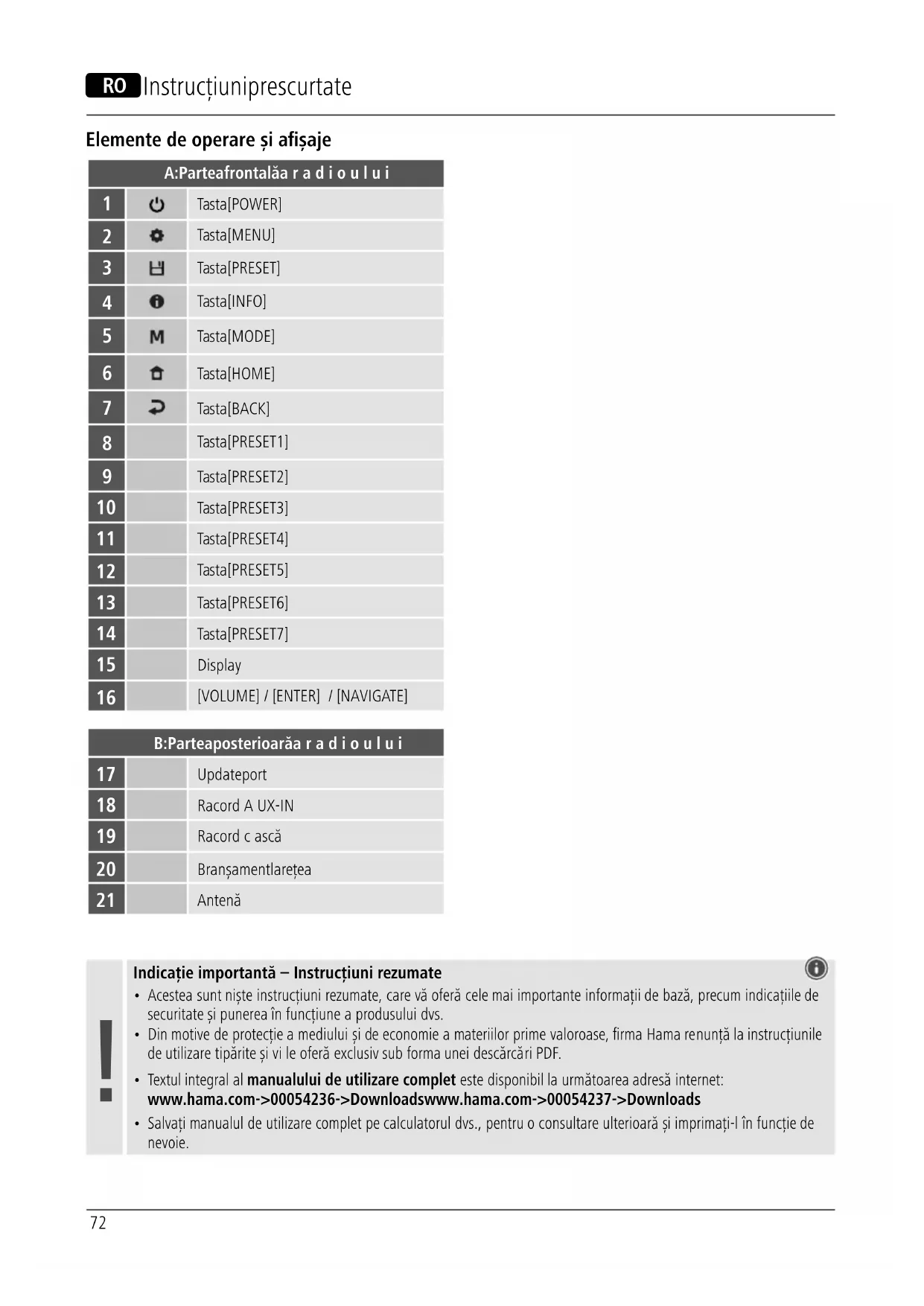 Nr.801/2013 pentru modicarea directivei (CE) Nr.1275/2008 Starea Durata timpului de declanșare Consumul de putere (Watt) modul oprit Comutatorul de alimentare0/I (numai la aparatele cu comutator de alimentare 0/I) – < 0,50 W modul standby manual (Starea de așteptare (Standby) la aparatele fără informații sau indicator de stare (manual)*) – < 0,50 W modul standby manual (Starea de așteptare (Standby) la aparatele cu informații sau indicator de stare(manual)*) – < 1.00 W modul standby automată (Standby la aparatele fără informații sau indicator de stare**) ≤ 20 min < 0,50 W așarea unor informaţii sau astării (Starea de așteptare automată (Standby) la aparatele cu informații sau indicator de stare**) ≤ 20 min < 1.00 W Modul standby în reţea*** ≤ 20 min < 2.00 W *Apăsațitasta Power ** Nu este înrețea -„Păstrarea conexiunii la rețea -NU“. Nu este disponibil înmodul de funcționareFM, înmăsura încare acesta există. *** Este înrețea -„Păstrarea conexiunii la rețea -DA“ Vă rugămsăaveți învederefaptul că un consum real de curent poate dependent de mai mulțifactori. Aceștia includ setările personale, modul de funcționare, temperaturaambientalășiversiunea de rmwareutilizată pentru produs. Valorile indicate anterior reprezintă valori maxime. Valorile de referință reale le putețigăsi la: www.hama.com->00054236 ->Downloads -> Date despreconsum www.hama.com->00054237 ->Downloads -> Date despreconsum77 S Snabbstartinstruktion Manöverelement och indikeringar A: Radions framsida