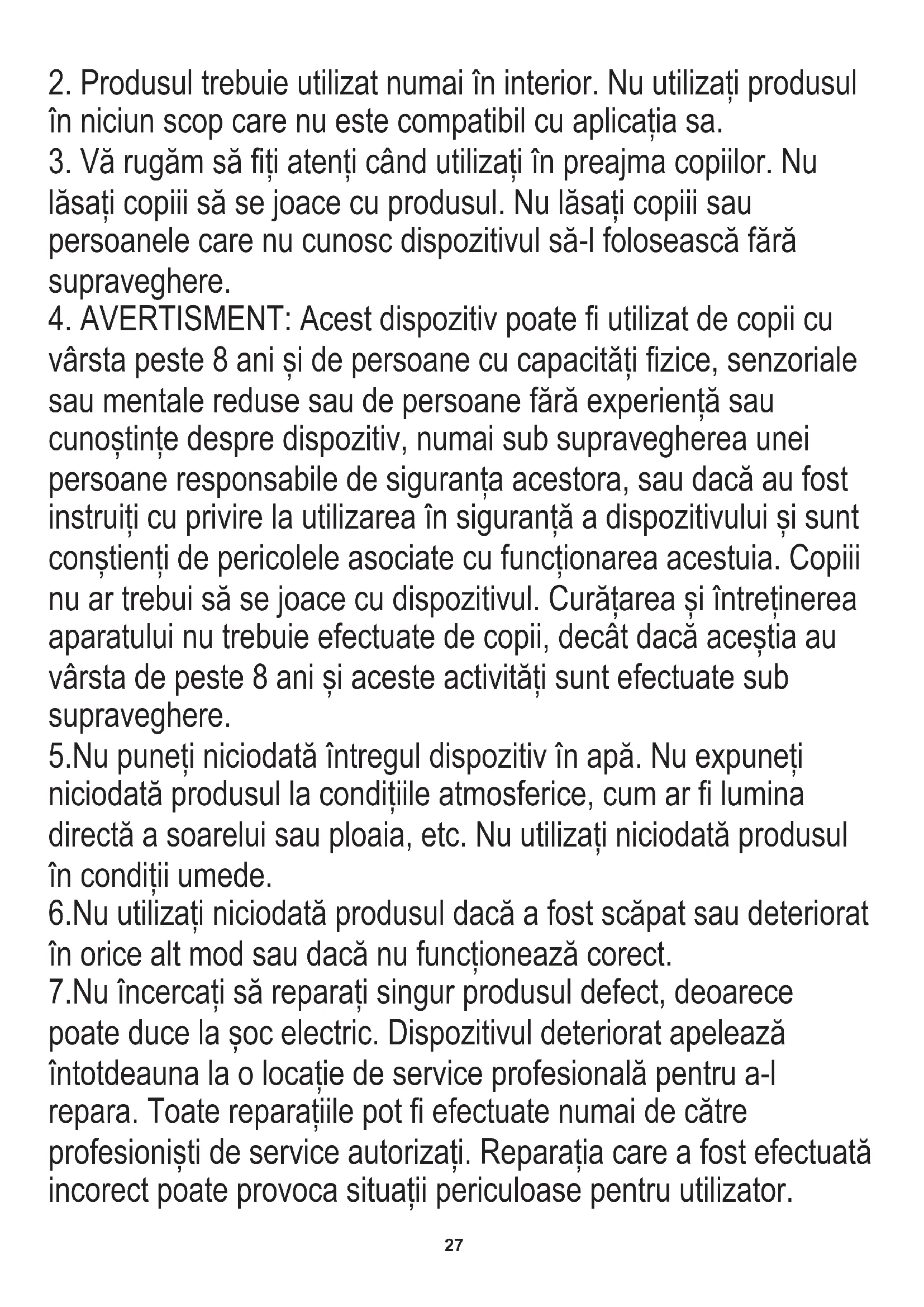 lăsați copiii să se joace cu produsul. Nu lăsați copiii sau persoanele care nu cunosc dispozitivul să-l folosească fără supraveghere. 7.Nu încercați să reparați singur produsul defect, deoarece poate duce la șoc electric. Dispozitivul deteriorat apelează întotdeauna la o locație de service profesională pentru a-l repara. Toate reparațiile pot fi efectuate numai de către profesioniști de service autorizați. Reparația care a fost efectuată incorect poate provoca situații periculoase pentru utilizator. 6.Nu utilizați niciodată produsul dacă a fost scăpat sau deteriorat în orice alt mod sau dacă nu funcționează corect.28