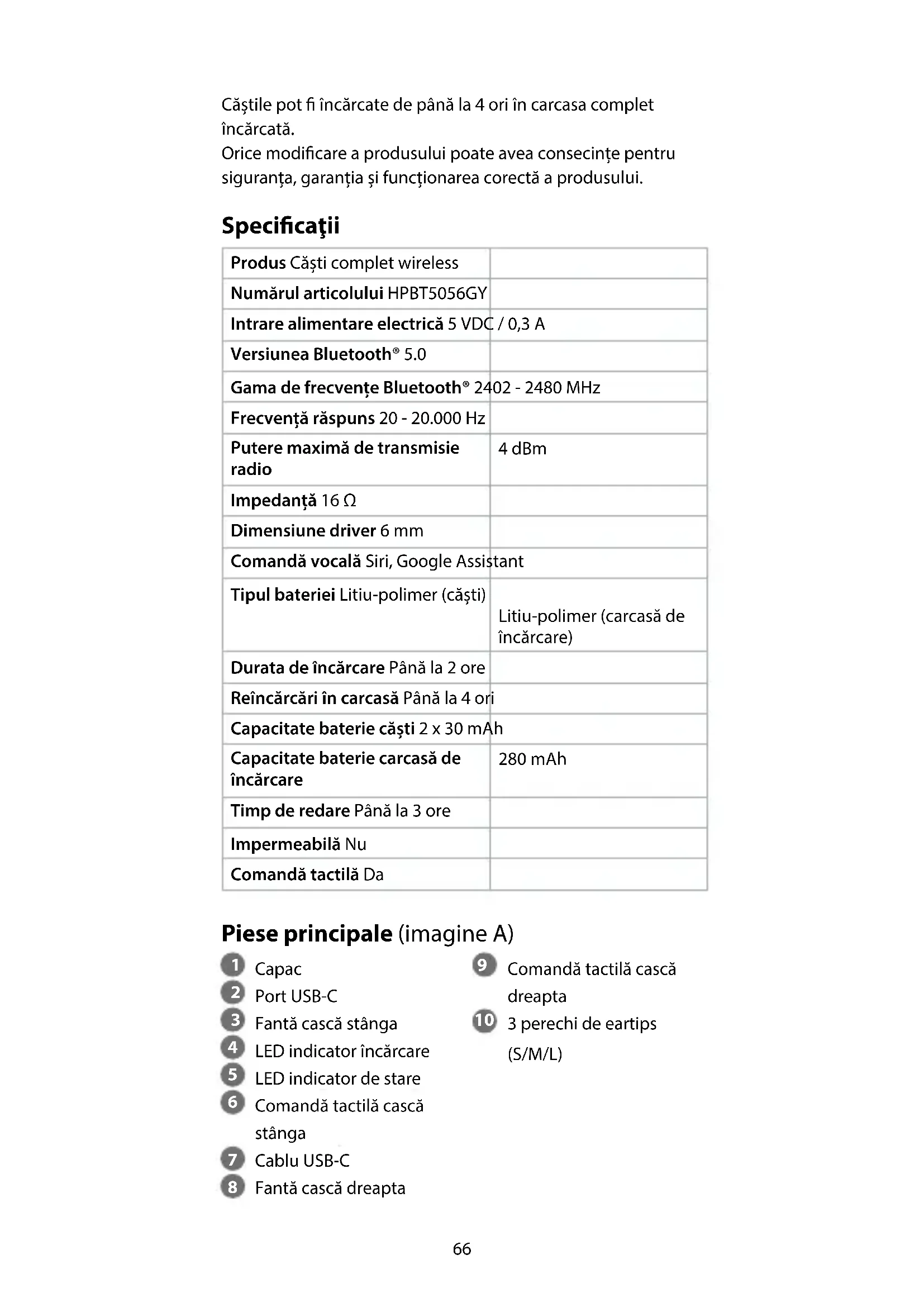 Ghid rapid de inițiere Căști complet wireless HPBT5056GY Pentru informații suplimentare, consultați manualul extins, disponibil online: ned.is/hpbt5056gy Utilizare preconizată Nedis HPBT5056GY este o pereche de căști complet wireless. Produsul poate asociat cu orice dispozitiv audio/video care are activată funcția Bluetooth.66 Căștile pot încărcate de până la 4 ori în carcasa complet încărcată. Orice modicare a produsului poate avea consecințe pentru siguranța, garanția și funcționarea corectă a produsului. Specicaţii Produs Căști complet wireless Numărul articolului HPBT5056GY Intrare alimentare electrică 5 VDC / 0,3 A Versiunea Bluetooth® 5.0 Gama de frecvențe Bluetooth® 2402 - 2480 MHz Frecvență răspuns 20 - 20.000 Hz Putere maximă de transmisie radio 4 dBm Impedanță 16 Ω Dimensiune driver 6 mm Comandă vocală Siri, Google Assistant Tipul bateriei Litiu-polimer (căști) Litiu-polimer (carcasă de încărcare) Durata de încărcare Până la 2 ore Reîncărcări în carcasă Până la 4 ori Capacitate baterie căști 2 x 30 mAh Capacitate baterie carcasă de încărcare 280 mAh Timp de redare Până la 3 ore Impermeabilă Nu Comandă tactilă Da Piese principale (imagine A)