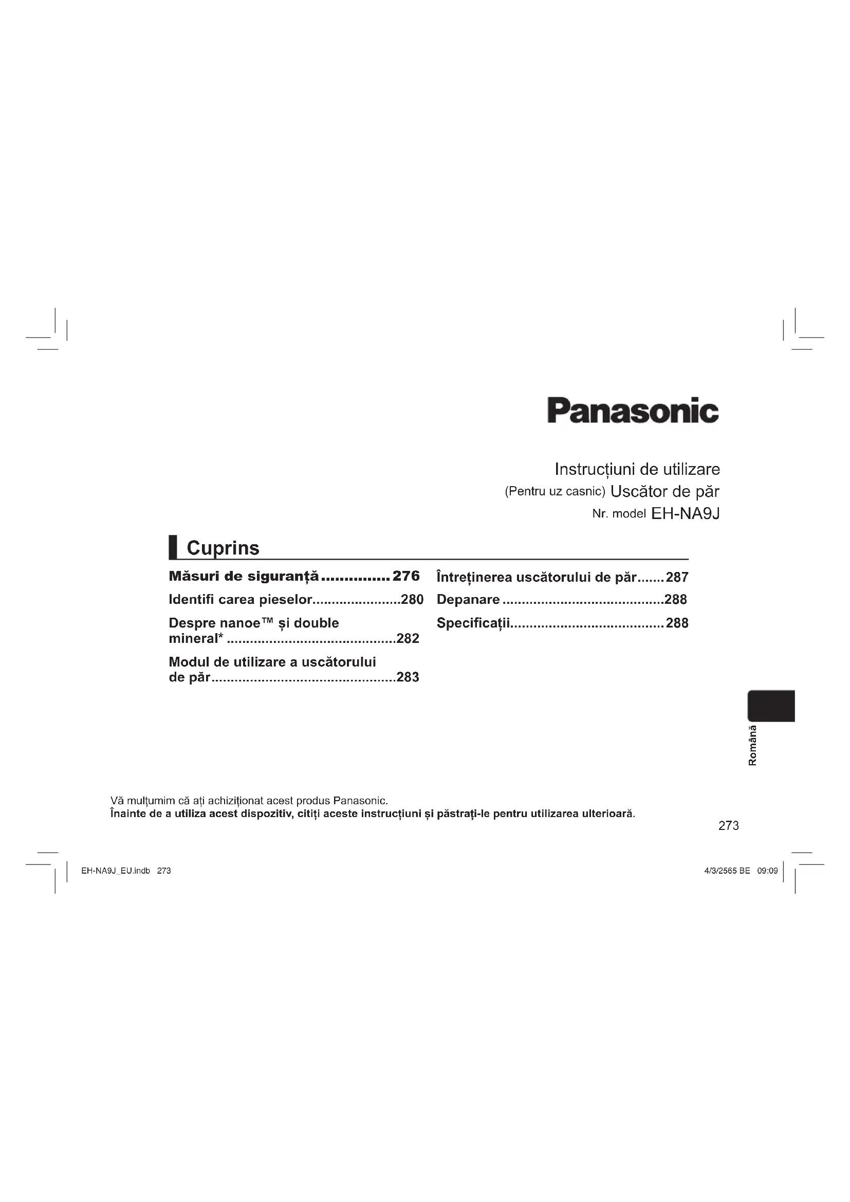 - Nu lăsați aparatul cu produse de coafare a părului sau cosmetice pe el. În acest caz, plasticul se poate deteriora, conducând la decolorare și fi suri. alcoholpolish remover EH-NA9J_EU.indb 287EH-NA9J_EU.indb 287 4/3/2565 BE 09:094/3/2565 BE 09:09288 Română Depanare Problemă Cauză posibilă Acțiune În interiorul aparatului se pot vedea scântei în timpul utilizării [HOT]. (Aceste scântei sunt cauzate de termostat, care este dispozitivul de protecție și nu sunt periculoase.) Praful se atașează de orifi ciul de intrare a aerului sau de orifi ciul de sufl are a aerului. Părul sau altceva blochează orifi ciul de intrare a aerului. Îndepărtați praful atașat. (Consultați pagina 287.) Aerul fi erbinte se transformă în aer rece în mod repetat. Nu blocați orifi ciul de intrare a aerului. Aerul fi erbinte este anormal de fi erbinte. Ștecherul este anormal de fi erbinte. Ștecherul nu este complet introdus în priză. Utilizați o priză în care ștecherul să se potrivească. Scânteile sunt generate în interiorul orifi ciului de evacuare nanoe™. Partea în formă de ac afl ată în spatele orifi ciului de evacuare nanoe™ este murdară. Efectuați întreținerea orifi ciului de evacuare nanoe™. (Consultați pagina 287.) În interiorul orifi ciului de evacuare nanoe™ s-a auzit un zgomot (pârâitură). Există un miros specifi c. Acest lucru se întâmplă pentru că nanoe™ și ionul mineral produc un miros specifi c; nu există nicio infl uență asupra corpului dvs. Din orifi ciul de evacuare nanoe™ ies picături de apă. Particule de apă sunt eliberate din când în când, prin orifi ciul nanoe™ la generarea nanoe™; acest lucru este normal. Lampa [HOT] pâlpâie rapid (de două ori pe secundă). Funcţionare anormală dispozitiv. Consultați un centru de service autorizat pentru reparații. Dacă problemele tot nu pot fi soluționate, contactați magazinul de la care ați achiziționat unitatea sau un centru de service autorizat de Panasonic pentru reparație. Specifi cații Model produs EH-NA9J Sursă de alimentare 220 V