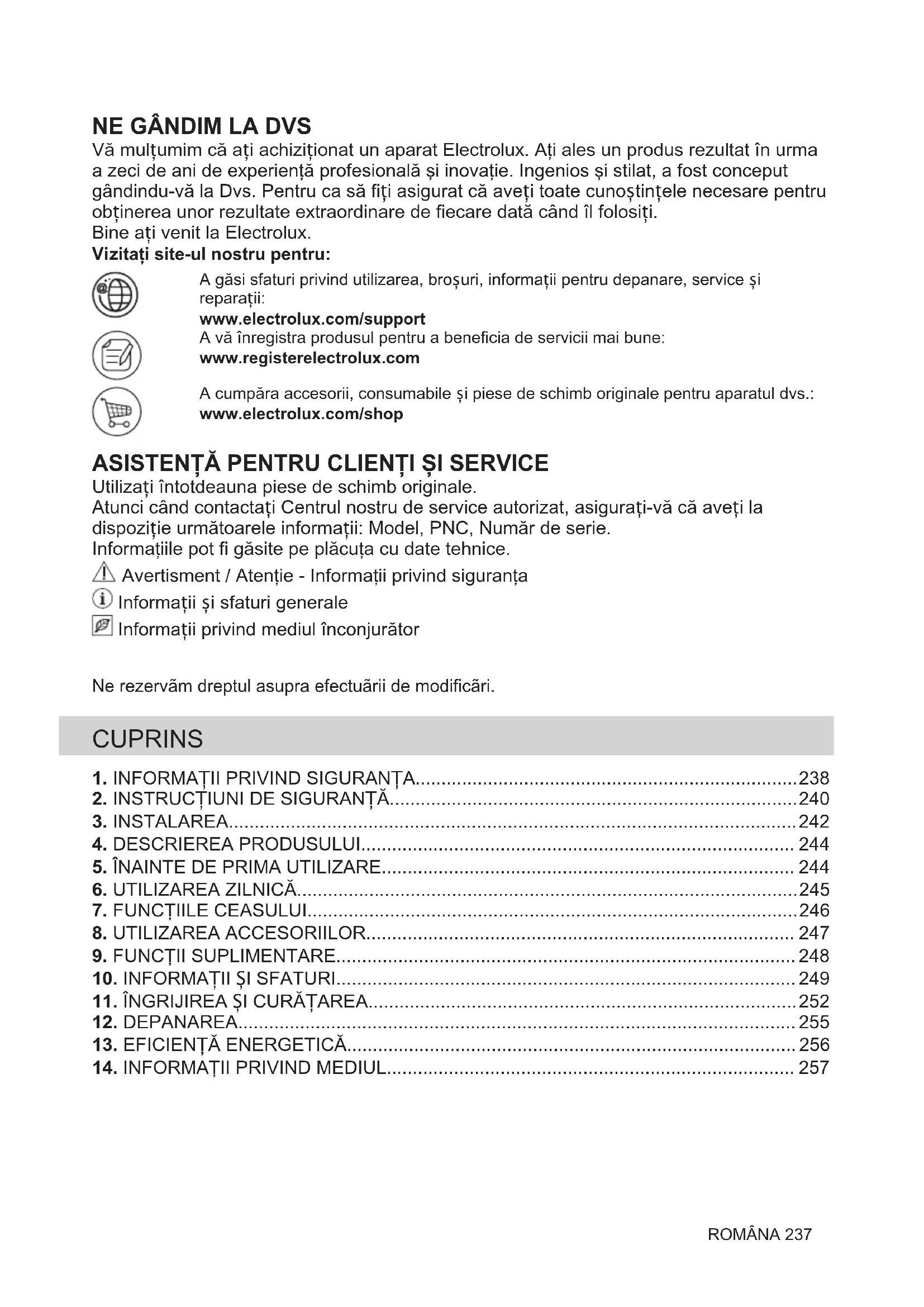Vă mulțumim că ați achiziționat un aparat Electrolux. Aţi ales un produs rezultat în urma a zeci de ani de experienţă profesională şi inovaţie. Ingenios şi stilat, a fost conceput gândindu-vă la Dvs. Pentru ca să fiți asigurat că aveți toate cunoștințele necesare pentru obținerea unor rezultate extraordinare de fiecare dată când îl folosiți. Bine ați venit la Electrolux. Vizitați site-ul nostru pentru: A găsi sfaturi privind utilizarea, broșuri, informații pentru depanare, service și reparații: www.electrolux.com/support A vă înregistra produsul pentru a beneficia de servicii mai bune: www.registerelectrolux.com A cumpăra accesorii, consumabile și piese de schimb originale pentru aparatul dvs.: www.electrolux.com/shop