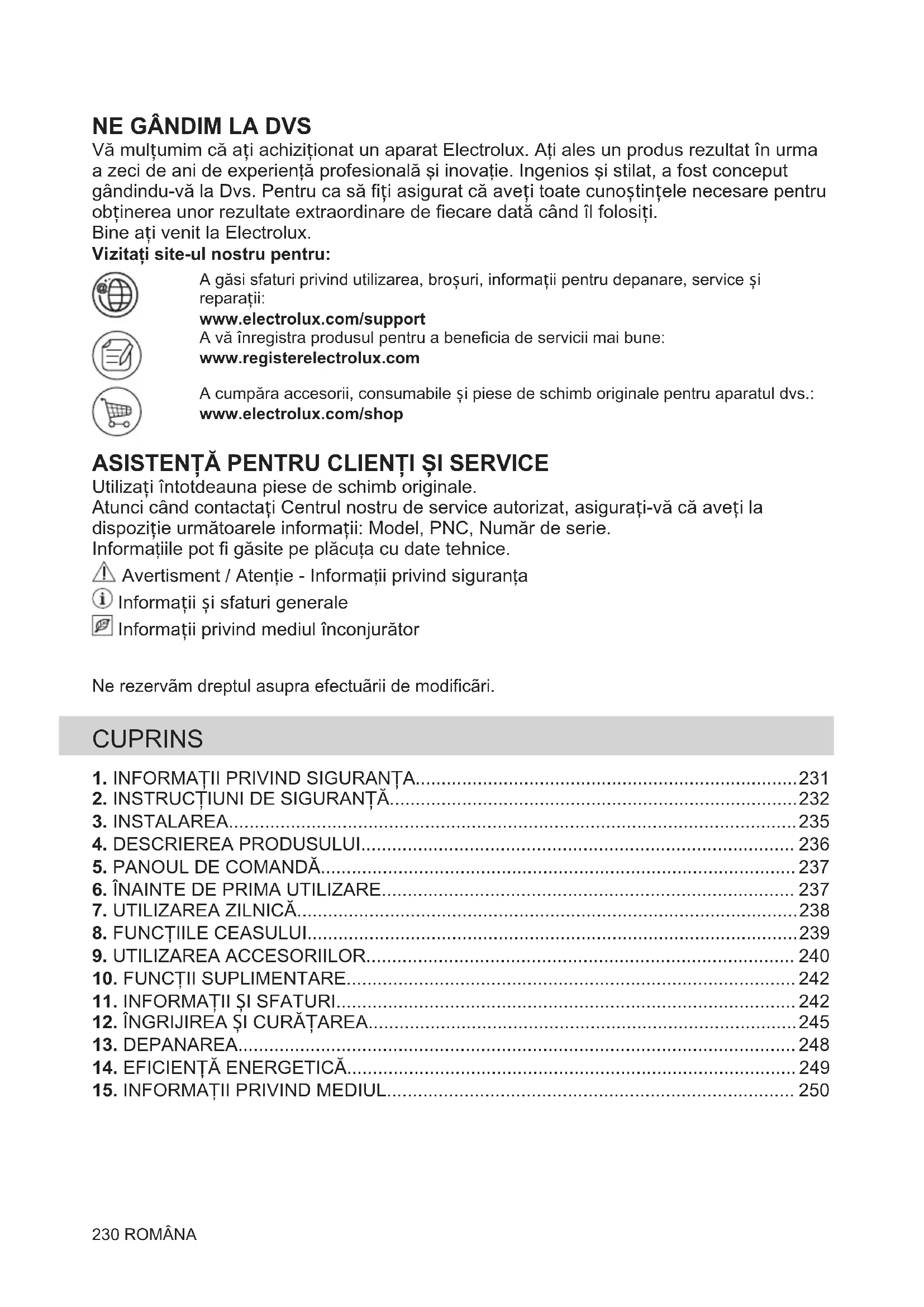 Vă mulțumim că ați achiziționat un aparat Electrolux. Aţi ales un produs rezultat în urma a zeci de ani de experienţă profesională şi inovaţie. Ingenios şi stilat, a fost conceput gândindu-vă la Dvs. Pentru ca să fiți asigurat că aveți toate cunoștințele necesare pentru obținerea unor rezultate extraordinare de fiecare dată când îl folosiți. Bine ați venit la Electrolux. Vizitați site-ul nostru pentru: A găsi sfaturi privind utilizarea, broșuri, informații pentru depanare, service și reparații: www.electrolux.com/support A vă înregistra produsul pentru a beneficia de servicii mai bune: www.registerelectrolux.com A cumpăra accesorii, consumabile și piese de schimb originale pentru aparatul dvs.: www.electrolux.com/shop