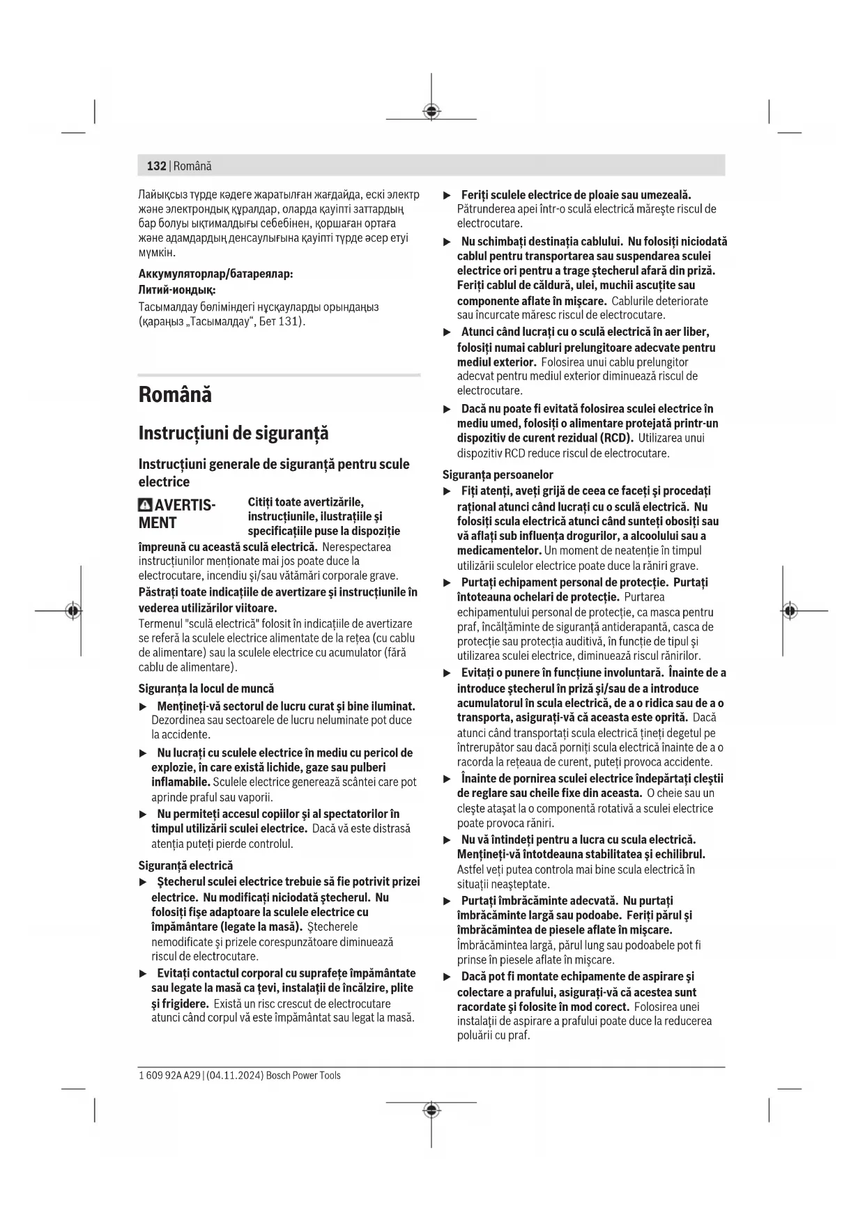 Аккумуляторлар/батареялар: Литий-иондық: Тасымалдау бөліміндегі нұсқауларды орындаңыз (қараңыз „Тасымалдау“, Бет131). Română Instrucţiuni de siguranţă Instrucţiuni generale de siguranţă pentru scule electrice AVERTIS- MENT Citiţi toate avertizările, instrucţiunile, ilustraţiile şi specificaţiile puse la dispoziţie împreună cu această sculă electrică. Nerespectarea instrucţiunilor menţionate mai jos poate duce la electrocutare, incendiu şi/sau vătămări corporale grave. Păstraţi toate indicaţiile de avertizare şi instrucţiunile în vederea utilizărilor viitoare. Termenul "sculă electrică" folosit în indicaţiile de avertizare se referă la sculele electrice alimentate de la reţea (cu cablu de alimentare) sau la sculele electrice cu acumulator (fără cablu de alimentare). Siguranţa la locul de muncă u Menţineţi‑vă sectorul de lucru curat şi bine iluminat. Dezordinea sau sectoarele de lucru neluminate pot duce la accidente. u Nu lucraţi cu sculele electrice în mediu cu pericol de explozie, în care există lichide, gaze sau pulberi inflamabile. Sculele electrice generează scântei care pot aprinde praful sau vaporii. u Nu permiteţi accesul copiilor şi al spectatorilor în timpul utilizării sculei electrice. Dacă vă este distrasă atenţia puteţi pierde controlul. Siguranţă electrică u Ştecherul sculei electrice trebuie să fie potrivit prizei electrice. Nu modificaţi niciodată ştecherul. Nu folosiţi fişe adaptoare la sculele electrice cu împământare (legate la masă). Ştecherele nemodificate şi prizele corespunzătoare diminuează riscul de electrocutare. u Evitaţi contactul corporal cu suprafeţe împământate sau legate la masă ca ţevi, instalaţii de încălzire, plite şi frigidere. Există un risc crescut de electrocutare atunci când corpul vă este împământat sau legat la masă. u Feriţi sculele electrice de ploaie sau umezeală. Pătrunderea apei într‑o sculă electrică măreşte riscul de electrocutare. u Nu schimbaţi destinaţia cablului. Nu folosiţi niciodată cablul pentru transportarea sau suspendarea sculei electrice ori pentru a trage ştecherul afară din priză. Feriţi cablul de căldură, ulei, muchii ascuţite sau componente aflate în mişcare. Cablurile deteriorate sau încurcate măresc riscul de electrocutare. u Atunci când lucraţi cu o sculă electrică în aer liber, folosiţi numai cabluri prelungitoare adecvate pentru mediul exterior. Folosirea unui cablu prelungitor adecvat pentru mediul exterior diminuează riscul de electrocutare. u Dacă nu poate fi evitată folosirea sculei electrice în mediu umed, folosiţi o alimentare protejată printr-un dispozitiv de curent rezidual (RCD). Utilizarea unui dispozitiv RCD reduce riscul de electrocutare. Siguranţa persoanelor u Fiţi atenţi, aveţi grijă de ceea ce faceţi şi procedaţi raţional atunci când lucraţi cu o sculă electrică. Nu folosiţi scula electrică atunci când sunteţi obosiţi sau vă aflaţi sub influenţa drogurilor, a alcoolului sau a medicamentelor. Un moment de neatenţie în timpul utilizării sculelor electrice poate duce la răniri grave. u Purtaţi echipament personal de protecţie. Purtaţi întoteauna ochelari de protecţie. Purtarea echipamentului personal de protecţie, ca masca pentru praf, încălţăminte de siguranţă antiderapantă, casca de protecţie sau protecţia auditivă, în funcţie de tipul şi utilizarea sculei electrice, diminuează riscul rănirilor. u Evitaţi o punere în funcţiune involuntară. Înainte de a introduce ştecherul în priză şi/sau de a introduce acumulatorul în scula electrică, de a o ridica sau de a o transporta, asiguraţi‑vă că aceasta este oprită. Dacă atunci când transportaţi scula electrică ţineţi degetul pe întrerupător sau dacă porniţi scula electrică înainte de a o racorda la reţeaua de curent, puteţi provoca accidente. u Înainte de pornirea sculei electrice îndepărtaţi cleştii de reglare sau cheile fixe din aceasta. O cheie sau un cleşte ataşat la o componentă rotativă a sculei electrice poate provoca răniri. u Nu vă întindeţi pentru a lucra cu scula electrică. Menţineţi-vă întotdeauna stabilitatea şi echilibrul. Astfel veţi putea controla mai bine scula electrică în situaţii neaşteptate. u Purtaţi îmbrăcăminte adecvată. Nu purtaţi îmbrăcăminte largă sau podoabe. Feriţi părul şi îmbrăcămintea de piesele aflate în mişcare. Îmbrăcămintea largă, părul lung sau podoabele pot fi prinse în piesele aflate în mişcare. u Dacă pot fi montate echipamente de aspirare şi colectare a prafului, asiguraţi‑vă că acestea sunt racordate şi folosite în mod corect. Folosirea unei instalaţii de aspirare a prafului poate duce la reducerea poluării cu praf. 1 609 92A A29 | (04.11.2024) Bosch Power ToolsRomână | 133 u Nu vă lăsaţi amăgiţi de uşurinţa în operare dobândită în urma folosirii frecvente a sculelor electrice şi nu ignoraţi principiile de siguranţă ale acestora. Neglijenţa poate provoca, într-o fracţiune de secundă, vătămări corporale grave. Utilizarea şi manevrarea atentă a sculelor electrice u Nu suprasolicitaţi scula electrică. Folosiţi pentru executarea lucrării dv. scula electrică destinată acelui scop. Cu scula electrică potrivită lucraţi mai bine şi mai sigur în domeniul de putere indicat. u Nu folosiţi scula electrică dacă aceasta are întrerupătorul defect. O sculă electrică, care nu mai poate fi pornită sau oprită, este periculoasă şi trebuie reparată. u Scoateţi ştecherul afară din priză şi/sau îndepărtaţi acumulatorul dacă este detaşabil, înainte de a executa reglaje, a schimba accesorii sau a depozita scula electrică. Această măsură de prevedere împiedică pornirea involuntară a sculei electrice. u Păstraţi s