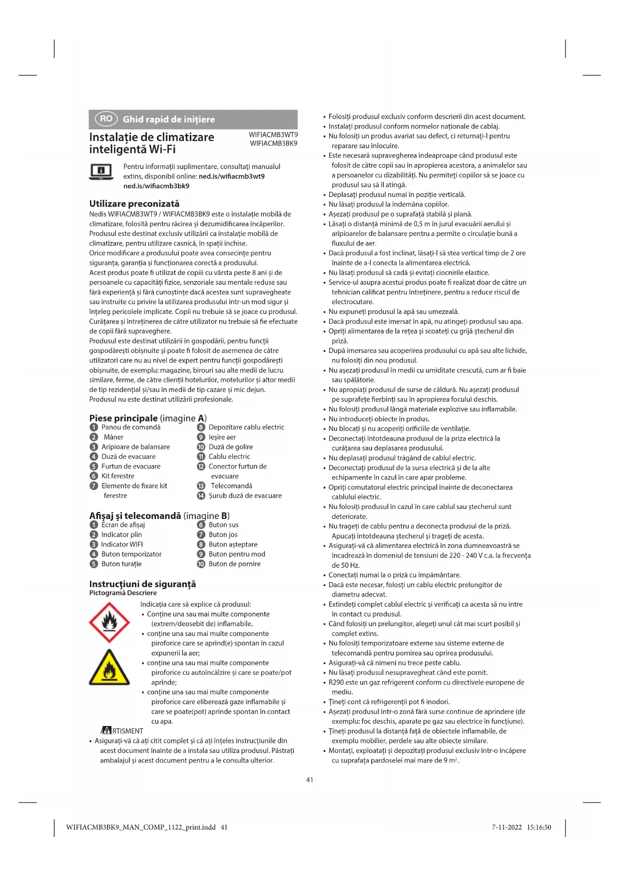 Ghid rapid de inițiere Instalație de climatizare inteligentă Wi-Fi WIFIACMB3WT9 WIFIACMB3BK9Pentru informații suplimentare, consultați manualul extins, disponibil online: ned.is/wiacmb3wt9 ned.is/wiacmb3bk9 Utilizare preconizată Nedis WIFIACMB3WT9 / WIFIACMB3BK9 este o instalație mobilă de climatizare, folosită pentru răcirea și dezumidicarea încăperilor.Produsul este destinat exclusiv utilizării ca instalație mobilă de climatizare, pentru utilizare casnică, în spații închise.Orice modicare a produsului poate avea consecințe pentru siguranța, garanția și funcționarea corectă a produsului.Acest produs poate utilizat de copiii cu vârsta peste 8 ani și de persoanele cu capacități zice, senzoriale sau mentale reduse sau fără experiență și fără cunoștințe dacă acestea sunt supravegheate sau instruite cu privire la utilizarea produsului într-un mod sigur și înțeleg pericolele implicate. Copii nu trebuie să se joace cu produsul. Curățarea și întreținerea de către utilizator nu trebuie să e efectuate de copii fără supraveghere.Produsul este destinat utilizării în gospodării, pentru funcții gospodărești obișnuite și poate folosit de asemenea de către utilizatori care nu au nivel de expert pentru funcții gospodărești obișnuite, de exemplu: magazine, birouri sau alte medii de lucru similare, ferme, de către clienții hotelurilor, motelurilor și altor medii de tip rezidențial și/sau în medii de tip cazare și mic dejun.Produsul nu este destinat utilizării profesionale. Piese principale (imagine A) 1 Panou de comandă 2 Mâner 3 Aripioare de balansare 4 Duză de evacuare 5 Furtun de evacuare 6 Kit ferestre 7 Elemente de xare kit ferestre 8 Depozitare cablu electric 9 Ieșire aer q Duză de golire w Cablu electric e Conector furtun de evacuare r Telecomandă t Șurub duză de evacuare Așaj și telecomandă (imagine B) 1 Ecran de așaj 2 Indicator plin 3 Indicator WIFI 4 Buton temporizator 5 Buton turație 6 Buton sus 7 Buton jos 8 Buton așteptare 9 Buton pentru mod q Buton de pornire Instrucțiuni de siguranță Pictogramă DescriereIndicația care să explice că produsul:• Conține una sau mai multe componente (extrem/deosebit de) inamabile.• conține una sau mai multe componente piroforice care se aprind(e) spontan în cazul expunerii la aer;• conține una sau mai multe componente piroforice cu autoîncălzire și care se poate/pot aprinde;• conține una sau mai multe componente piroforice care eliberează gaze inamabile și care se poate(pot) aprinde spontan în contact cu apa. AVERTISMENT• Asigurați-vă că ați citit complet și că ați înțeles instrucțiunile din acest document înainte de a instala sau utiliza produsul. Păstrați ambalajul și acest document pentru a le consulta ulterior. WIFIACMB3BK9_MAN_COMP_1122_print.indd 41WIFIACMB3BK9_MAN_COMP_1122_print.indd 41 7-11-2022 15:16:507-11-2022 15:16:5042 Instalarea aplicației Nedis SmartLife