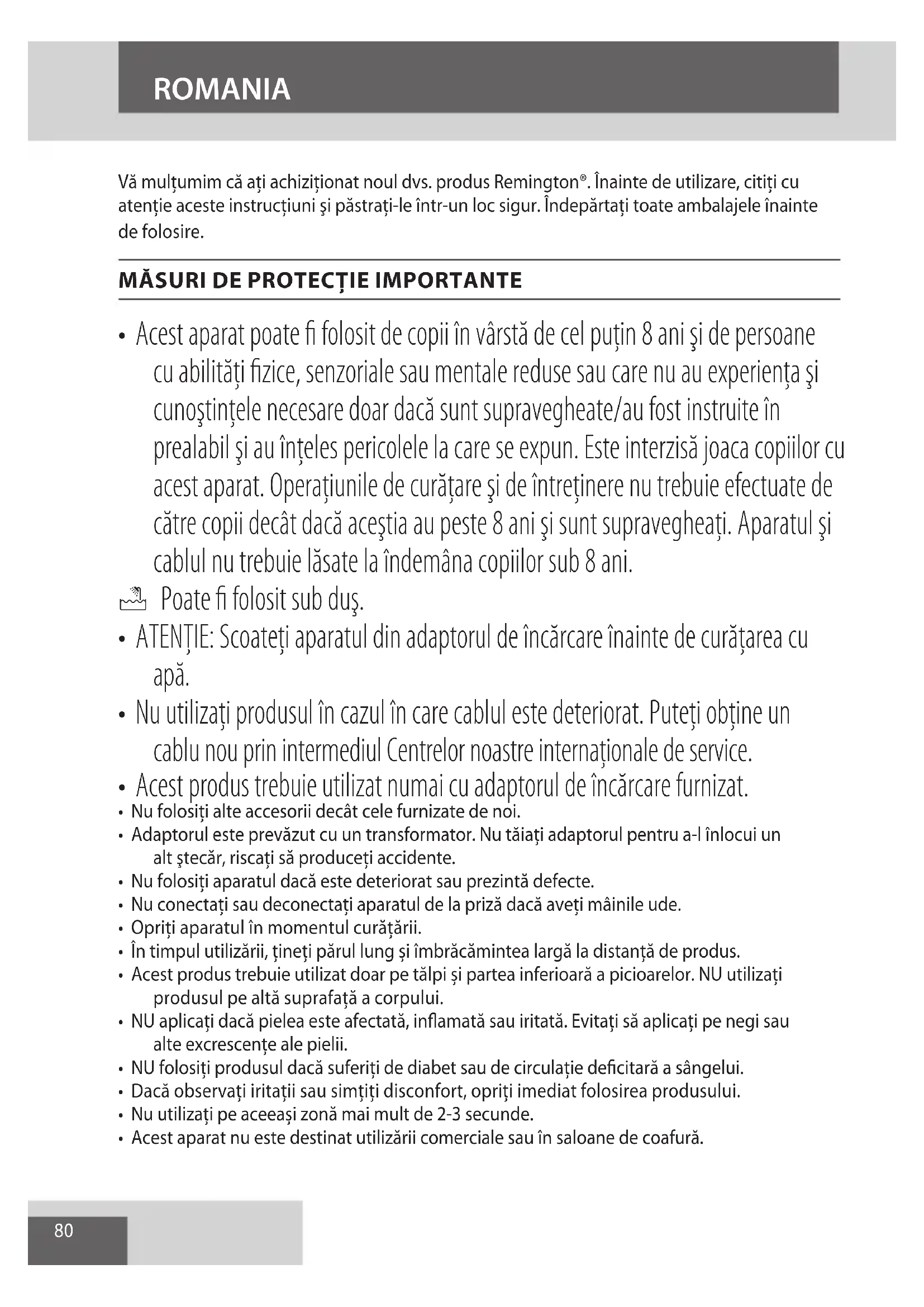 AE80 Vă mulţumim că aţi achiziţionat noul dvs. produs Remington®. Înainte de utilizare, citiţi cu atenţie aceste instrucţiuni şi păstraţi-le într-un loc sigur. Îndepărtaţi toate ambalajele înainte de folosire.