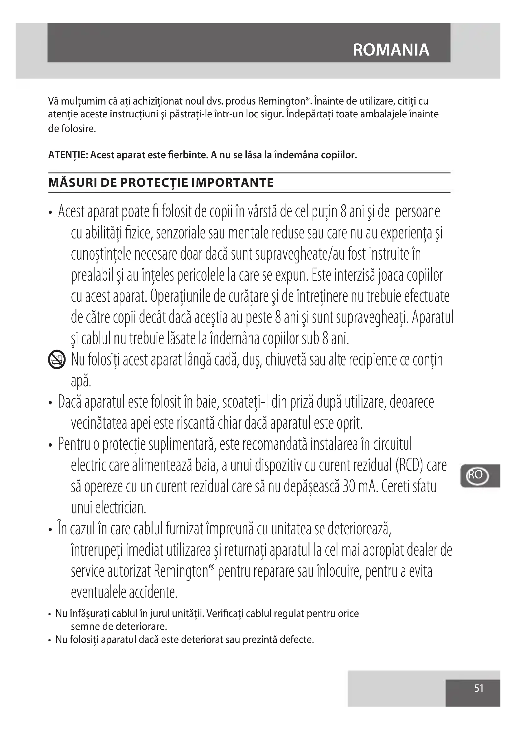 - In cazul in care cablul furnizat impreună cu unitatea se deteriorează, intrerupeți imediat utilizareași returnați aparatul la cel mai apropriat dealer de service autorizat Remington® pentru reparare sau înlocuire, pentru a evita eventualele accidente.