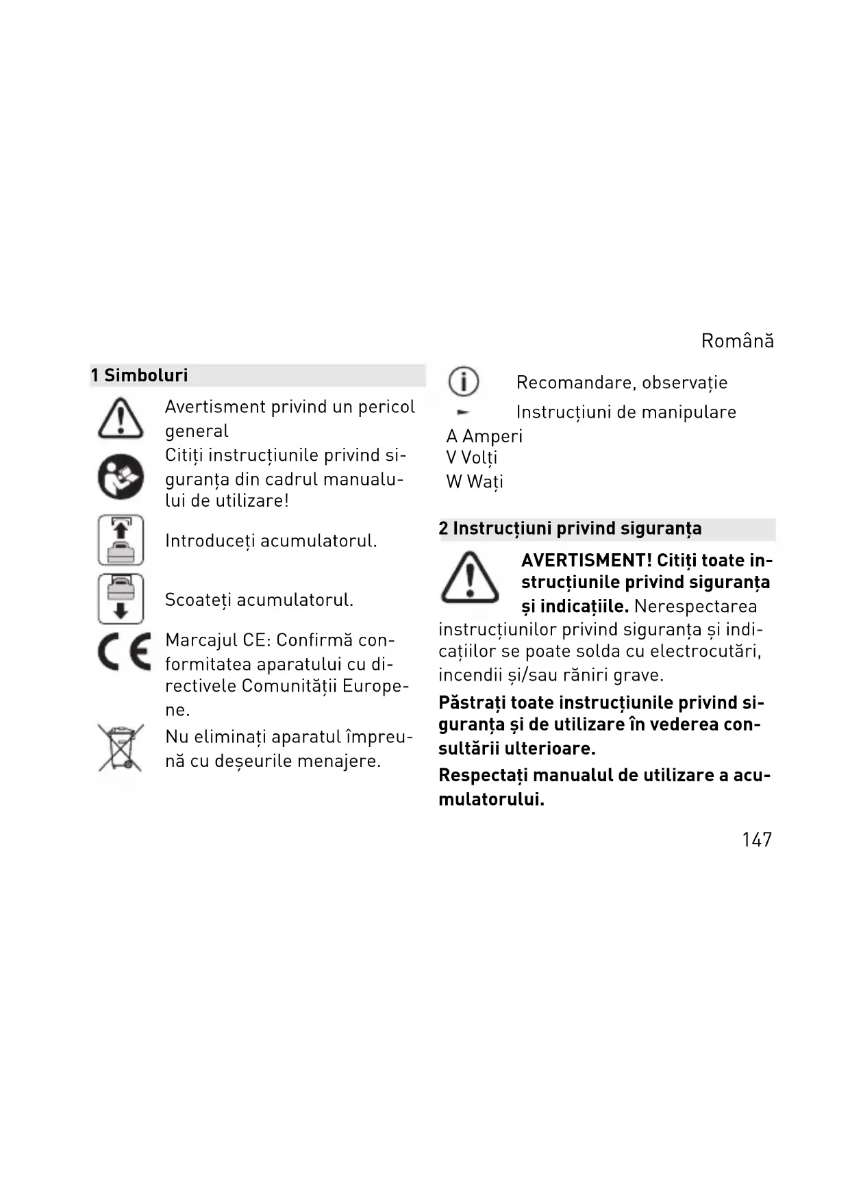 ► Para evitar danos, limpar o aparelho com um pano macio e seco. Não uti lizar solventes. Português 1459 Ambiente Não deite a ferramenta no lixo doméstico! Encami nhar as ferramentas, aces sórios e embalagens para reaproveitamento ecológi co. Respeitar as normas nacionais em vigor. Apenas países da UE: de acordo com a Diretiva Europeia sobre resíduos de equipamentos elétricos e eletrónicos e a sua transposição para a legislação nacional, as ferramentas elétricas usa das devem ser recolhidas separada mente e sujeitas a uma reciclagem que proteja o meio ambiente. Informações sobre REACH: www.fes tool.com/reach Português 1461 Simboluri Avertisment privind un pericol general Citiţi instrucţiunile privind si guranţa din cadrul manualu lui de utilizare! Introduceţi acumulatorul. Scoateţi acumulatorul. Marcajul CE: Confirmă con formitatea aparatului cu di rectivele Comunităţii Europe ne. Nu eliminaţi aparatul împreu nă cu deşeurile menajere. Recomandare, observaţie Instrucţiuni de manipulare A Amperi V Volţi W Waţi 2 Instrucţiuni privind siguranţa AVERTISMENT! Citiţi toate in strucţiunile privind siguranţa şi indicaţiile. Nerespectarea instrucţiunilor privind siguranţa şi indi caţiilor se poate solda cu electrocutări, incendii şi/sau răniri grave. Păstraţi toate instrucţiunile privind si guranţa şi de utilizare în vederea con sultării ulterioare. Respectaţi manualul de utilizare a acu mulatorului. Română 147– Nu este permisă utilizarea aparatului în ploaie sau în medii umede. Umidi tatea din aparat provoca un scurtcir cuit şi incendiu. – Nu introduceţi cuie, sârme sau alte obiecte similare în portul USB. În caz contrar, acestea pot provoca scurtcir cuite, emanaţii de fum sau incendii. – Nu racordaţi porturile USB cu fişa, cu o altă sursă electrică sau cu un apa rat cu tensiunea înaltă. În caz con trar, există pericolul de incendiu. Por turile USB sunt prevăzute exclusiv pentru încărcarea aparatelor cu ten siune mică (ieşire USB-A = 5 V / 2,4 A; ieşire compatibilă cu USB‑C