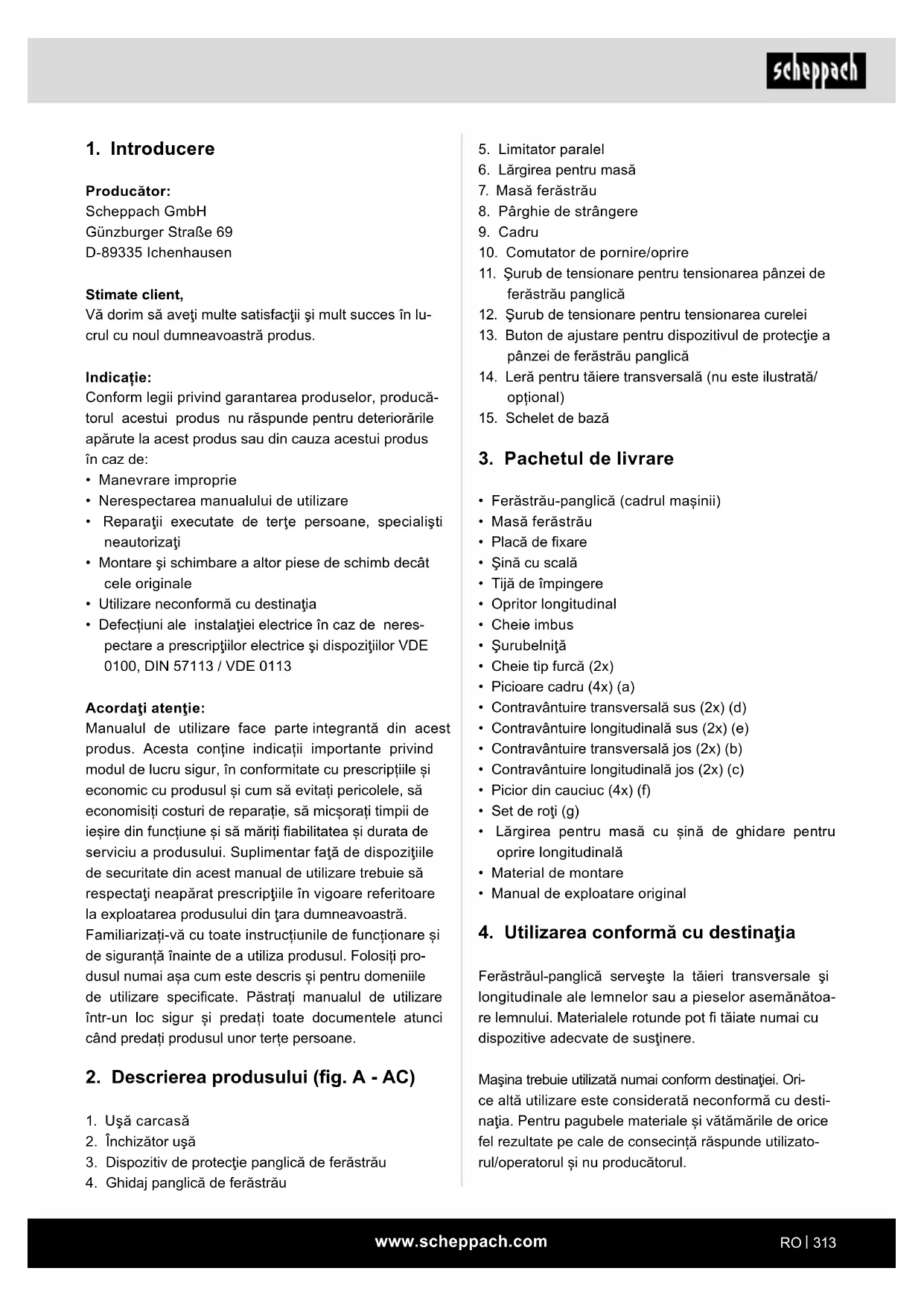 Producător: Scheppach GmbH Günzburger Straße 69 D-89335 Ichenhausen Stimate client, Vă dorim să aveţi multe satisfacţii şi mult succes în lu- crul cu noul dumneavoastră produs. Indicație: Conform legii privind garantarea produselor, producă- torul acestui produs nu răspunde pentru deteriorările apărute la acest produs sau din cauza acestui produs în caz de: