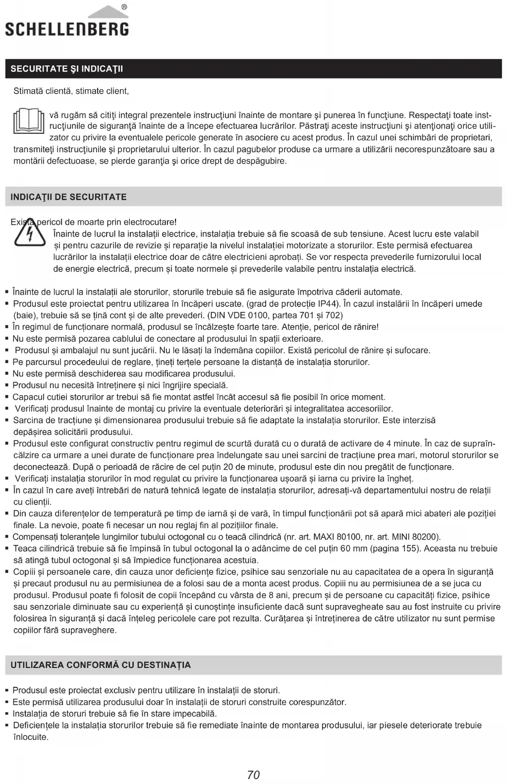 Produsul este proiectat exclusiv pentru utilizare în instalații de storuri. Este permisă utilizarea produsului doar în instalații de storuri construite corespunzător. Instalația de storuri trebuie să e în stare impecabilă. Deciențele la instalația storurilor trebuie să e remediate înainte de montarea produsului, iar piesele deteriorate trebuie înlocuite.RO