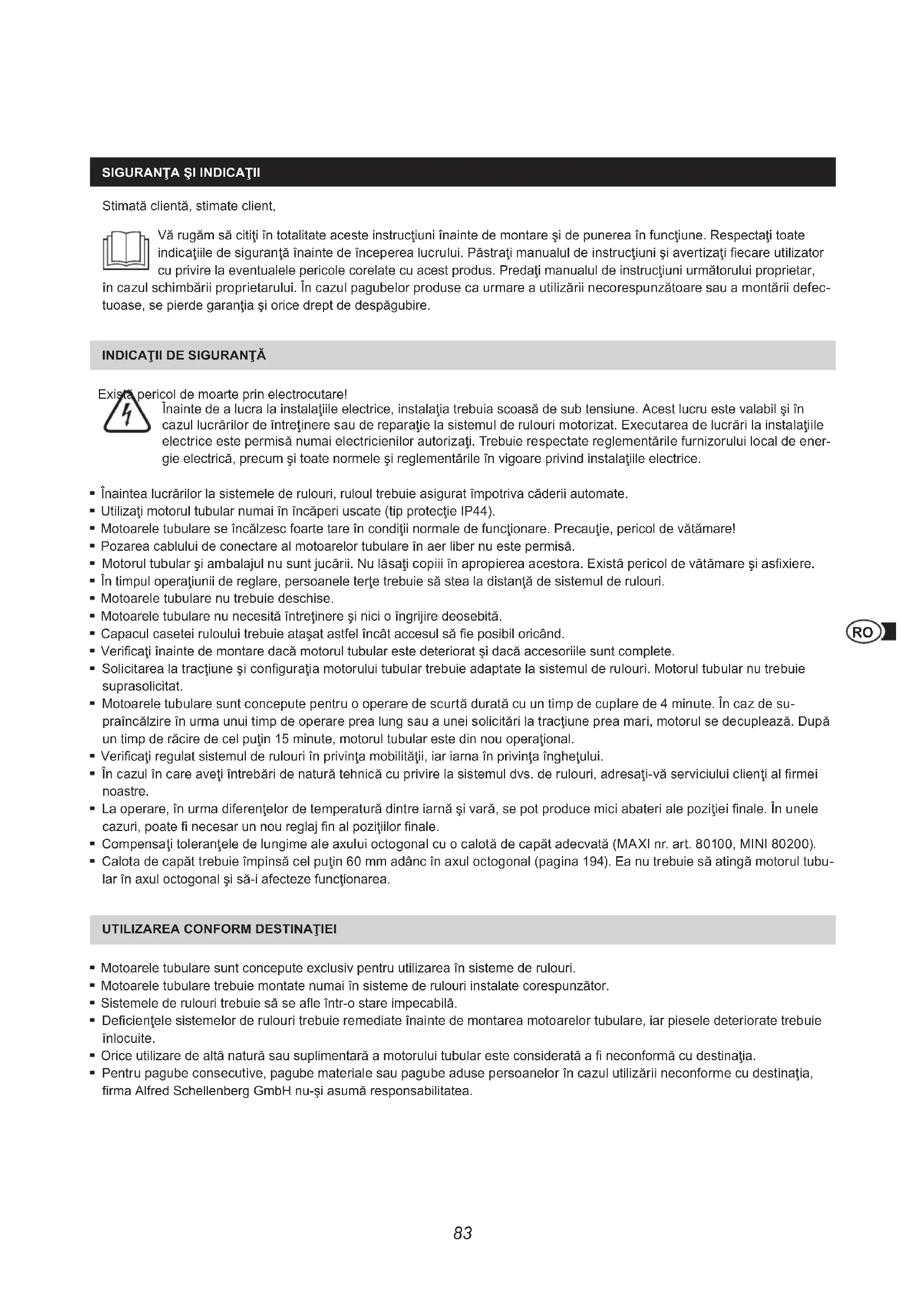 SigUrAnţA şi inDicAţii Stimată clientă, stimate client, Vă rugăm să citiţi în totalitate aceste instrucţiuni înainte de montare şi de punerea în funcţiune. Respectaţi toate indicaţiile de siguranţă înainte de începerea lucrului. Păstraţi manualul de instrucţiuni şi avertizaţi ecare utilizator cu privire la eventualele pericole corelate cu acest produs. Predaţi manualul de instrucţiuni următorului proprietar, în cazul schimbării proprietarului. În cazul pagubelor produse ca urmare a utilizării necorespunzătoare sau a montării defec- tuoase, se pierde garanţia şi orice drept de despăgubire. inDicAţii DE SigUrAnţă Există pericol de moarte prin electrocutare! Înainte de a lucra la instalaţiile electrice, instalaţia trebuia scoasă de sub tensiune. Acest lucru este valabil şi în cazul lucrărilor de întreţinere sau de reparaţie la sistemul de rulouri motorizat. Executarea de lucrări la instalaţiile electrice este permisă numai electricienilor autorizaţi. Trebuie respectate reglementările furnizorului local de ener- gie electrică, precum şi toate normele şi reglementările în vigoare privind instalaţiile electrice. Înaintea lucrărilor la sistemele de rulouri, ruloul trebuie asigurat împotriva căderii automate. Utilizaţi motorul tubular numai în încăperi uscate (tip protecţie IP44). Motoarele tubulare se încălzesc foarte tare în condiţii normale de funcţionare. Precauţie, pericol de vătămare! Pozarea cablului de conectare al motoarelor tubulare în aer liber nu este permisă. Motorul tubular şi ambalajul nu sunt jucării. Nu lăsaţi copiii în apropierea acestora. Există pericol de vătămare şi asxiere. În timpul operaţiunii de reglare, persoanele terţe trebuie să stea la distanţă de sistemul de rulouri. Motoarele tubulare nu trebuie deschise. Motoarele tubulare nu necesită întreţinere şi nici o îngrijire deosebită. Capacul casetei ruloului trebuie ataşat astfel încât accesul să e posibil oricând. Vericaţi înainte de montare dacă motorul tubular este deteriorat şi dacă accesoriile sunt complete. Solicitarea la tracţiune şi conguraţia motorului tubular trebuie adaptate la sistemul de rulouri. Motorul tubular nu trebuie suprasolicitat. Motoarele tubulare sunt concepute pentru o operare de scurtă durată cu un timp de cuplare de 4 minute. În caz de su- praîncălzire în urma unui timp de operare prea lung sau a unei solicitări la tracţiune prea mari, motorul se decuplează. După un timp de răcire de cel puţin 15 minute, motorul tubular este din nou operaţional. Vericaţi regulat sistemul de rulouri în privinţa mobilităţii, iar iarna în privinţa îngheţului. În cazul în care aveţi întrebări de natură tehnică cu privire la sistemul dvs. de rulouri, adresaţivă serviciului clienţi al rmei noastre. La operare, în urma diferenţelor de temperatură dintre iarnă şi vară, se pot produce mici abateri ale poziţiei nale. În unele cazuri, poate necesar un nou reglaj n al poziţiilor nale. Compensaţi toleranţele de lungime ale axului octogonal cu o calotă de capăt adecvată (MAXI nr. art. 80100, MINI 80200). Calota de capăt trebuie împinsă cel puţin 60 mm adânc în axul octogonal (pagina 194). Ea nu trebuie să atingă motorul tubu- lar în axul octogonal şi săi afecteze funcţionarea. UtiLizArEA conform DEStinAţiEi Motoarele tubulare sunt concepute exclusiv pentru utilizarea în sisteme de rulouri. Motoarele tubulare trebuie montate numai în sisteme de rulouri instalate corespunzător. Sistemele de rulouri trebuie să se ae întro stare impecabilă. Decienţele sistemelor de rulouri trebuie remediate înainte de montarea motoarelor tubulare, iar piesele deteriorate trebuie înlocuite. Orice utilizare de altă natură sau suplimentară a motorului tubular este considerată a neconformă cu destinaţia. Pentru pagube consecutive, pagube materiale sau pagube aduse persoanelor în cazul utilizării neconforme cu destinaţia, rma Alfred Schellenberg GmbH nuşi asumă responsabilitatea.84