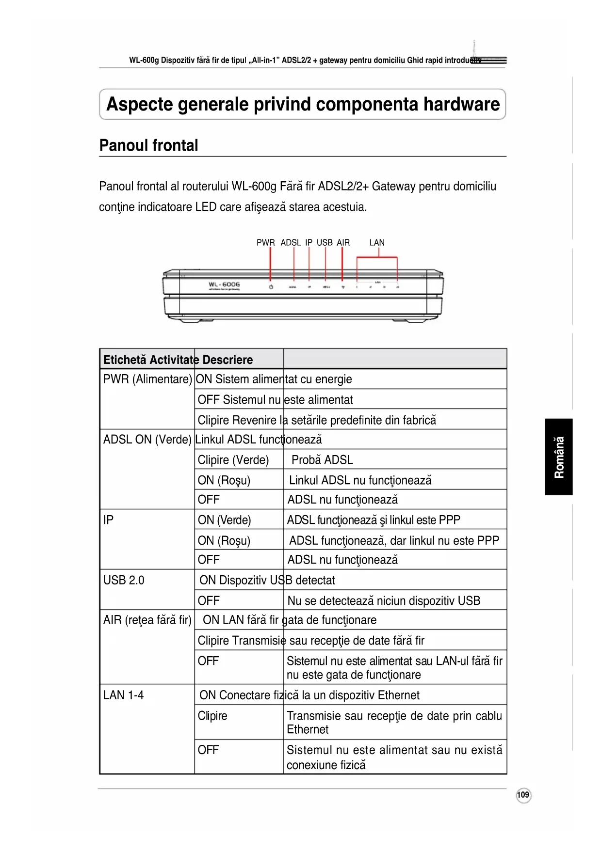 RomânăItalianoPortuguêsFrançais Aspecte generale privind componenta hardware Panoul frontal Panoul frontal al routerului WL-600g Fără r ADSL2/2+ Gateway pentru domiciliu conţine indicatoare LED care aşează starea acestuia. Etichetă Activitate Descriere PWR (Alimentare) ON Sistem alimentat cu energie OFF Sistemul nu este alimentat Clipire Revenire la setările predenite din fabrică ADSL ON (Verde) Linkul ADSL funcţionează Clipire (Verde) Probă ADSL ON (Roşu) Linkul ADSL nu funcţionează OFF ADSL nu funcţionează IP ON (Verde) ADSL funcţionează şi linkul este PPP ON (Roşu) ADSL funcţionează, dar linkul nu este PPP OFF ADSL nu funcţionează USB 2.0 ON Dispozitiv USB detectat OFF Nu se detectează niciun dispozitiv USB AIR (reţea fără r) ON LAN fără r gata de funcţionare Clipire Transmisie sau recepţie de date fără r OFF Sistemul nu este alimentat sau LAN-ul fără r nu este gata de funcţionare LAN 1-4 ON Conectare zică la un dispozitiv Ethernet Clipire Transmisie sau recepţie de date prin cablu Ethernet OFF Sistemul nu este alimentat sau nu există conexiune zică PWR ADSL IP USB AIR LANWL-600g Dispozitiv fără r de tipul „All-in-1” ADSL2/2 + gateway pentru domiciliu Ghid rapid introductiv WL-600g Dispozitiv fără r de tipul „All-in-1” ADSL2/2 + gateway pentru domiciliu Ghid rapid introductiv