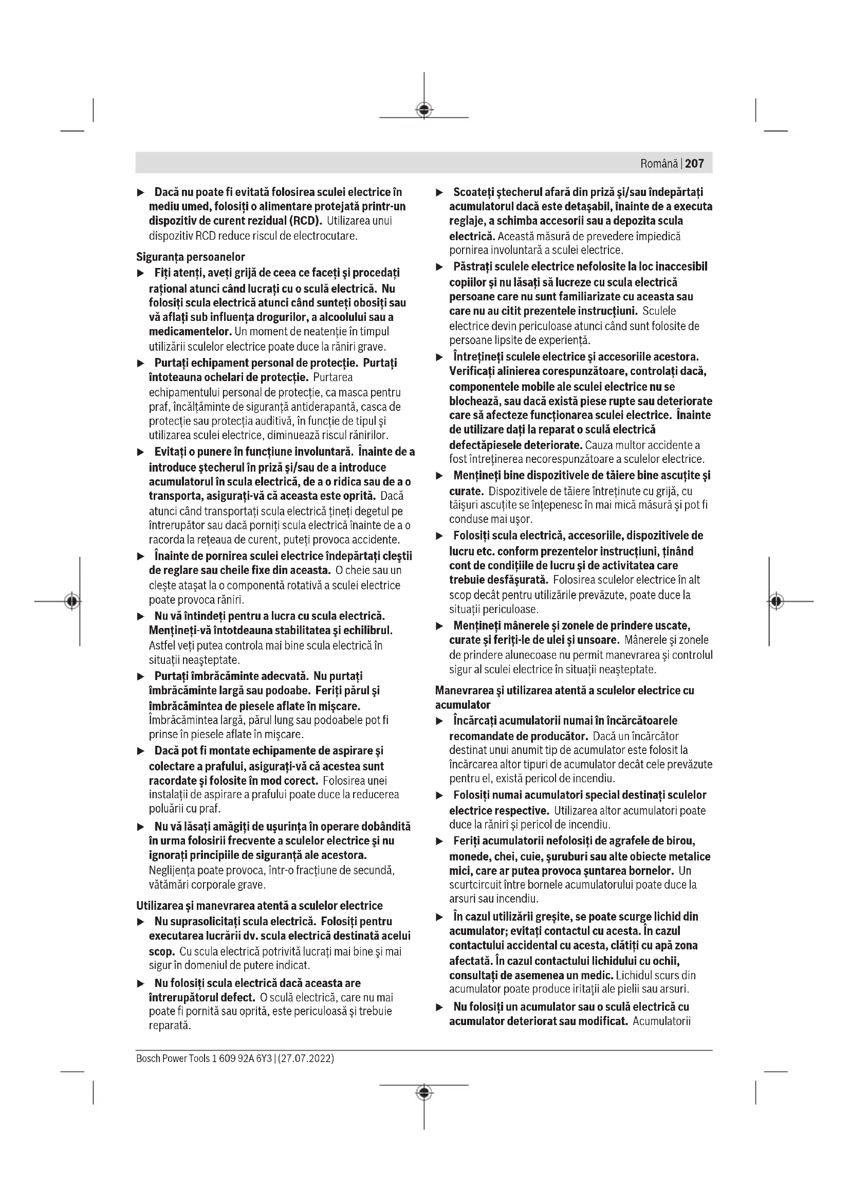 Ұсынылған литий-иондық аккумуляторлар қауіпті тауарларға қойылатын талаптарға бағынады. Пайдаланушы аккумуляторларды көшеде қосымша құжаттарсыз тасымалдай алады. Үшінші тұлғалар (мысалы, әуе көлігі немесе жіберу) орамаға және маркаларға қойылатын арнайы талаптарды сақтау керек. Жіберуге дайындау кезінде қауіпті жүктерді тасымалдау маманымен хабарласу керек. Аккумуляторды корпусы зақымдалған болса ғана жіберіңіз. Ашық түйіспелерді желімдеңіз және аккумуляторды орамада қозғалмайтындай ораңыз. Қажет болса, қосымша ұлттық ережелерді сақтаңыз. Кәдеге жарату Электр құралдарды, аккумуляторларды, керек-жарақтарды және орау материалдарын экологиялық тұрғыдан дұрыс утилизациялауға тапсыру керек. Электр құралдарды және аккумуляторларды/батареяларды үй қоқысына тастамаңыз! Тек қана ЕО елдері үшін: Ескі электрлік және электрондық құрылғылар туралы 2012/19/EU еуропалық директивасы және оның ұлттық заңнамада қолданылуы бойынша пайдалануға бұдан былай жарамсыз электрлік құралдарды және 2006/66/ ЕC еуропалық директивасы бойынша зақымдалған немесе ескірген аккумуляторларды/батареяларды бөлек жинап, қоршаған орта үшін қауіпсіз жолмен қайта өңдеуге жіберу қажет. Қате жолмен кәдеге жаратылған ескі электрлік және электрондық құрылғылар қауіпті заттардың болу мүмкіндігіне байланысты қоршаған ортаға және адам денсаулығына зиянды әсер тигізуі мүмкін. Аккумуляторлар/батареялар: Литий-иондық: Тасымалдау бөліміндегі нұсқауларды орындаңыз (қараңыз „Тасымалдау“, Бет206). Română Instrucţiuni de siguranţă Instrucţiuni generale de siguranţă pentru scule electrice AVERTIS- MENT Citiţi toate avertizările, instrucţiunile, ilustraţiile şi specificaţiile puse la dispoziţie împreună cu această sculă electrică. Nerespectarea instrucţiunilor menţionate mai jos poate duce la electrocutare, incendiu şi/sau vătămări corporale grave. Păstraţi toate indicaţiile de avertizare şi instrucţiunile în vederea utilizărilor viitoare. Termenul "sculă electrică" folosit în indicaţiile de avertizare se referă la sculele electrice alimentate de la reţea (cu cablu de alimentare) sau la sculele electrice cu acumulator (fără cablu de alimentare). Siguranţa la locul de muncă u Menţineţi‑vă sectorul de lucru curat şi bine iluminat. Dezordinea sau sectoarele de lucru neluminate pot duce la accidente. u Nu lucraţi cu sculele electrice în mediu cu pericol de explozie, în care există lichide, gaze sau pulberi inflamabile. Sculele electrice generează scântei care pot aprinde praful sau vaporii. u Nu permiteţi accesul copiilor şi al spectatorilor în timpul utilizării sculei electrice. Dacă vă este distrasă atenţia puteţi pierde controlul. Siguranţă electrică u Ştecherul sculei electrice trebuie să fie potrivit prizei electrice. Nu modificaţi niciodată ştecherul. Nu folosiţi fişe adaptoare la sculele electrice cu împământare (legate la masă). Ştecherele nemodificate şi prizele corespunzătoare diminuează riscul de electrocutare. u Evitaţi contactul corporal cu suprafeţe împământate sau legate la masă ca ţevi, instalaţii de încălzire, plite şi frigidere. Există un risc crescut de electrocutare atunci când corpul vă este împământat sau legat la masă. u Feriţi sculele electrice de ploaie sau umezeală. Pătrunderea apei într‑o sculă electrică măreşte riscul de electrocutare. u Nu schimbaţi destinaţia cablului. Nu folosiţi niciodată cablul pentru transportarea sau suspendarea sculei electrice ori pentru a trage ştecherul afară din priză. Feriţi cablul de căldură, ulei, muchii ascuţite sau componente aflate în mişcare. Cablurile deteriorate sau încurcate măresc riscul de electrocutare. u Atunci când lucraţi cu o sculă electrică în aer liber, folosiţi numai cabluri prelungitoare adecvate pentru mediul exterior. Folosirea unui cablu prelungitor adecvat pentru mediul exterior diminuează riscul de electrocutare. 1 609 92A 6Y3 | (27.07.2022) Bosch Power ToolsRomână | 207 u Dacă nu poate fi evitată folosirea sculei electrice în mediu umed, folosiţi o alimentare protejată printr-un dispozitiv de curent rezidual (RCD). Utilizarea unui dispozitiv RCD reduce riscul de electrocutare. Siguranţa persoanelor u Fiţi atenţi, aveţi grijă de ceea ce faceţi şi procedaţi raţional atunci când lucraţi cu o sculă electrică. Nu folosiţi scula electrică atunci când sunteţi obosiţi sau vă aflaţi sub influenţa drogurilor, a alcoolului sau a medicamentelor. Un moment de neatenţie în timpul utilizării sculelor electrice poate duce la răniri grave. u Purtaţi echipament personal de protecţie. Purtaţi întoteauna ochelari de protecţie. Purtarea echipamentului personal de protecţie, ca masca pentru p